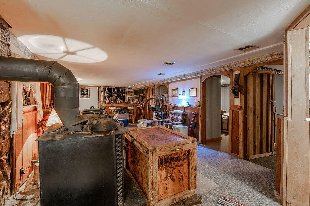 This lower level also features a bar area and wood stove, creating a cozy and flexible space for guests or entertainment.