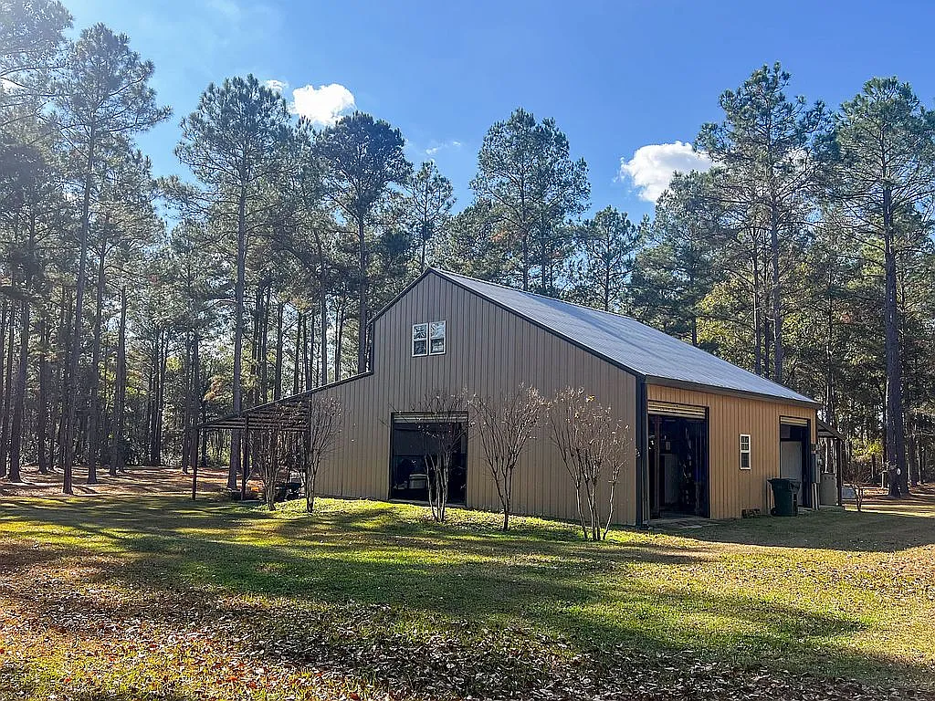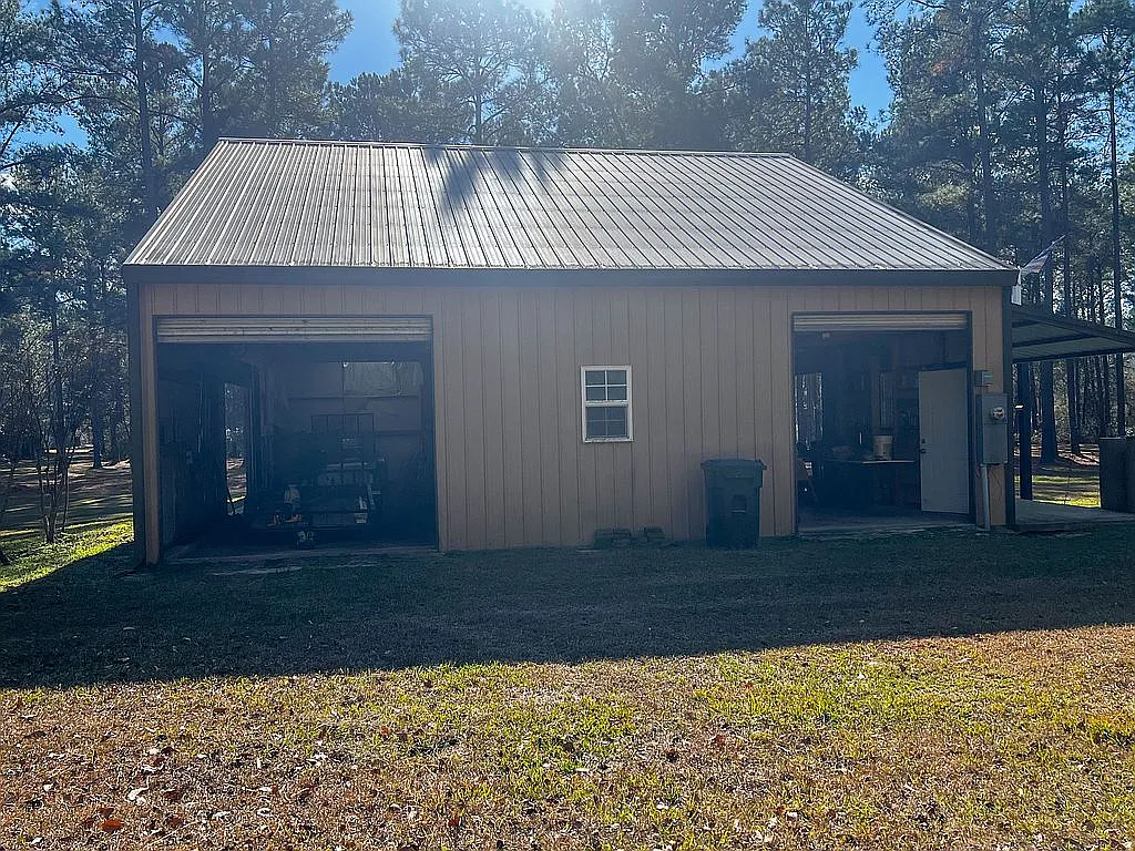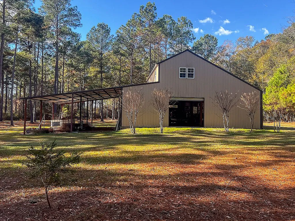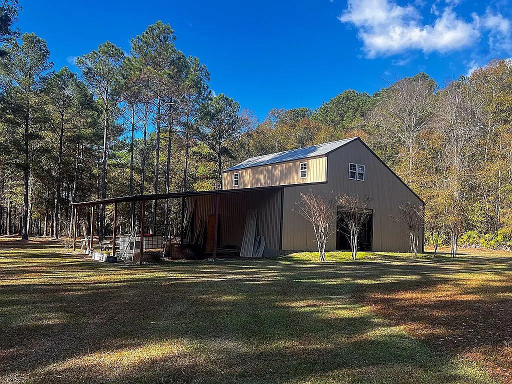 The property features mostly wooded acreage with mature pine trees, providing excellent seclusion and abundant wildlife—perfect for hunting, camping, or enjoying nature. A standout feature is the 40′ x 36′ two-story metal building already on site. The first floor is designed for workshop use or vehicle and equipment storage, while the second level includes approximately 250 square feet of finished living space, completed in 2024, with additional room for storage or future expansion.