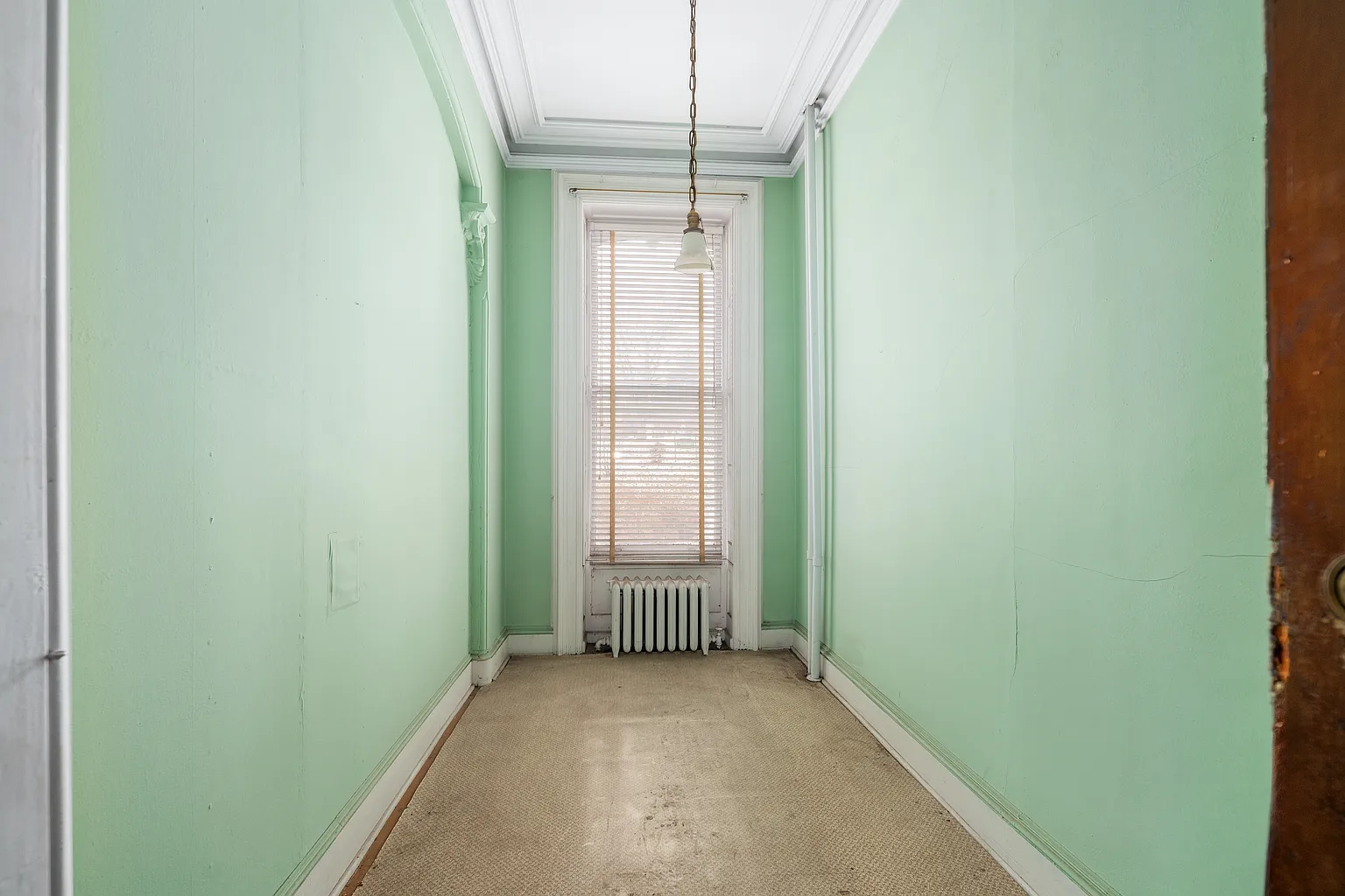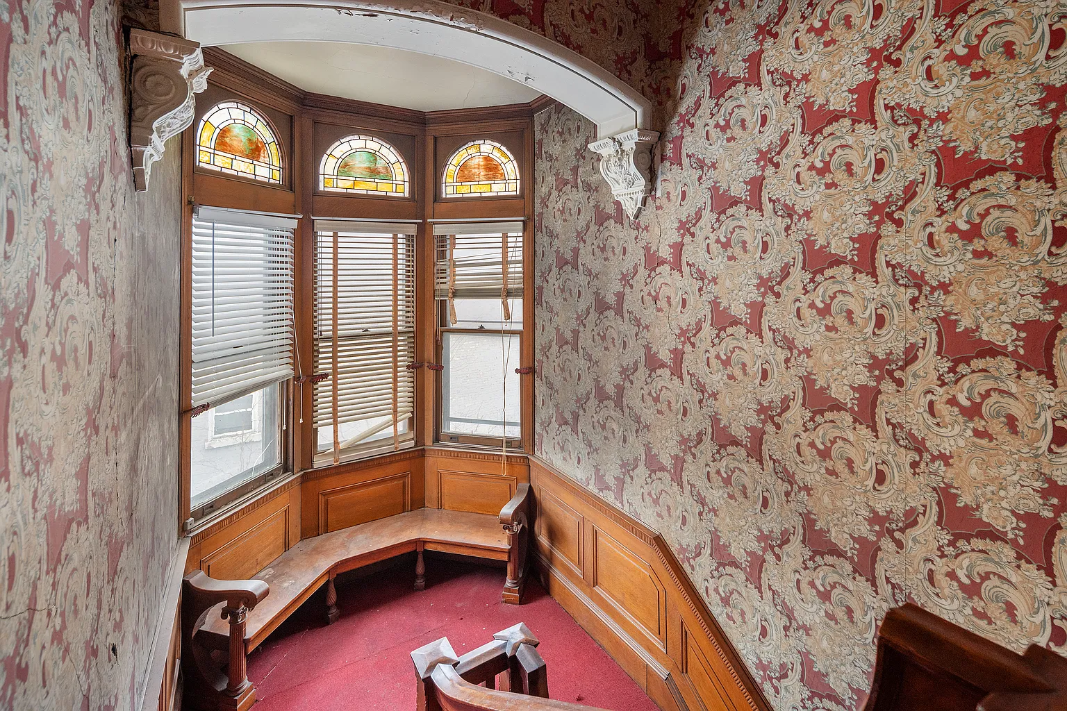 Historic details such as crown molding, cathedral ceilings, and built-in features still remain, showcasing the original craftsmanship.