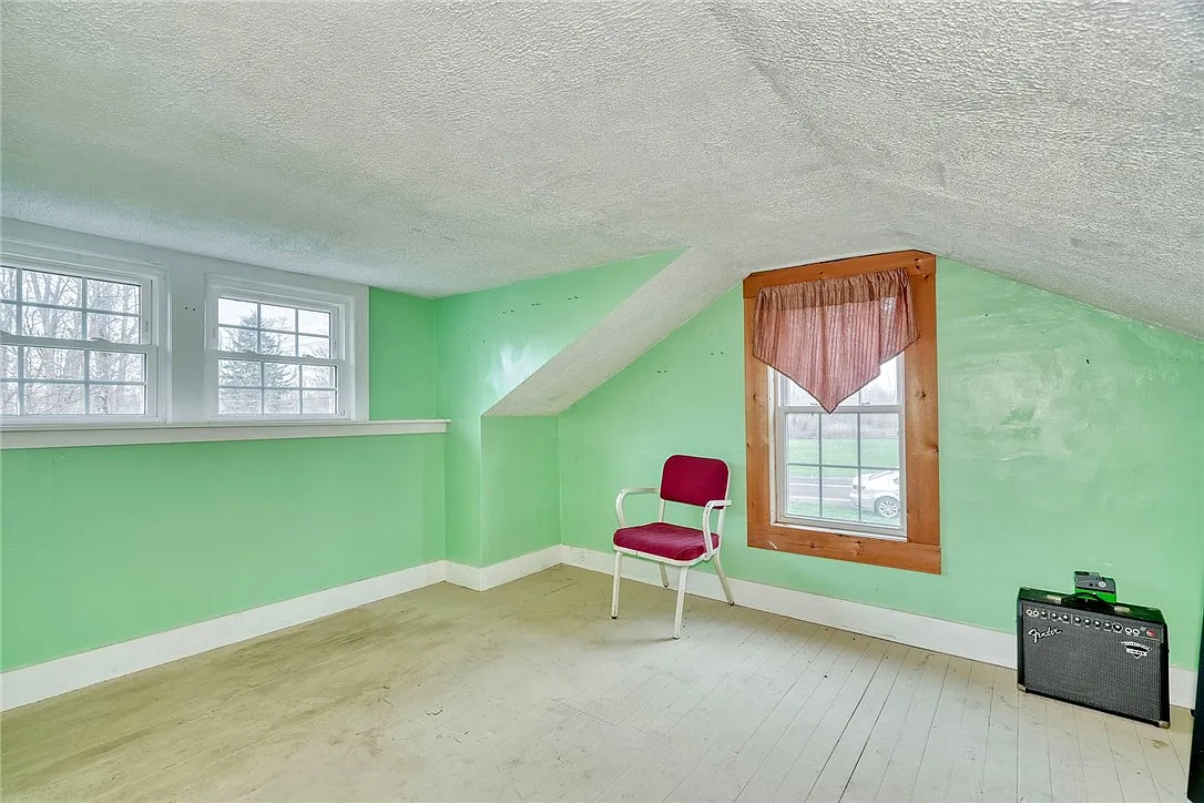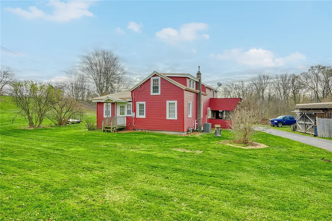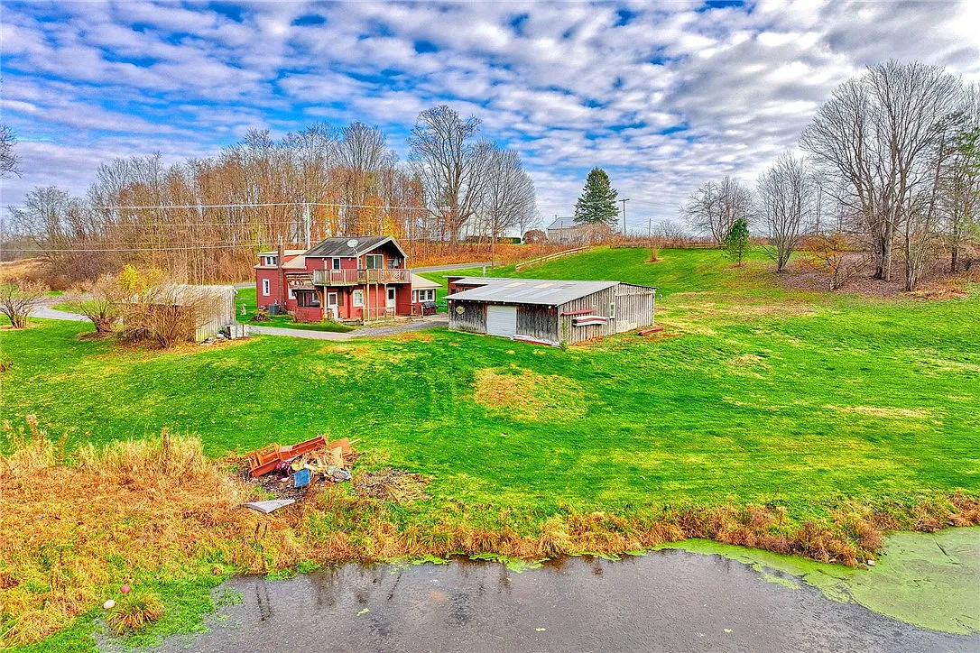 Nestled on 12.8 acres of woods, trails, and a private pond, this charming 1800-built Cape Cod farmhouse on 31088 Ridge Road in Wolcott, New York, offers the perfect blend of rustic charm and modern comfort. With three generously sized bedrooms and two full bathrooms across 1,542 square feet, the home features natural wood beauty throughout, an eat-in country kitchen with vaulted wood ceilings, quality cabinetry, a walk-in pantry, new countertops, and stainless steel appliances. Formal living and dining rooms with hardwood floors create a warm, inviting space, while the first-floor bedroom and updated bath with extra-wide, no-step shower add convenience and accessibility. A main-level laundry/mudroom and office complete the functional layout. Upstairs, the primary bedroom is a retreat of its own, boasting a soaring cathedral ceiling, two double closets, and a slider leading to a balcony and expansive decking overlooking endless views of nature. A third bedroom offers flexibility for family, guests, or hobby space. Recent updates include a gas furnace, central air, water heater, vinyl siding, metal roof, thermal windows, and a 200-amp electric panel. Outdoors, the property shines with a detached two-car garage with workshop space, horse stalls, a large shed, and multiple outbuildings perfect for hobby farming or storage. Whether you dream of riding horses, gardening, or simply enjoying the peace and privacy of rural living, this property offers endless possibilities. Easily accessible yet private, it’s close enough to town for convenience but far enough to escape the everyday rush. Don’t miss the opportunity to make it yours for a captivating price – schedule your private showing today and experience the endless beauty and potential firsthand!