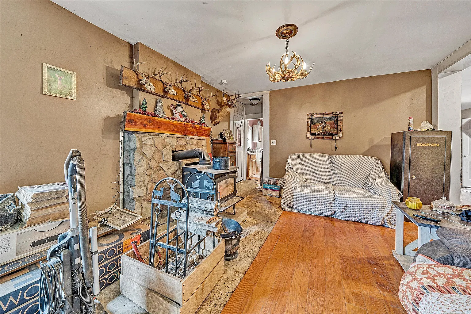 Inside, the home features wood flooring and a fireplace, adding warmth and character.