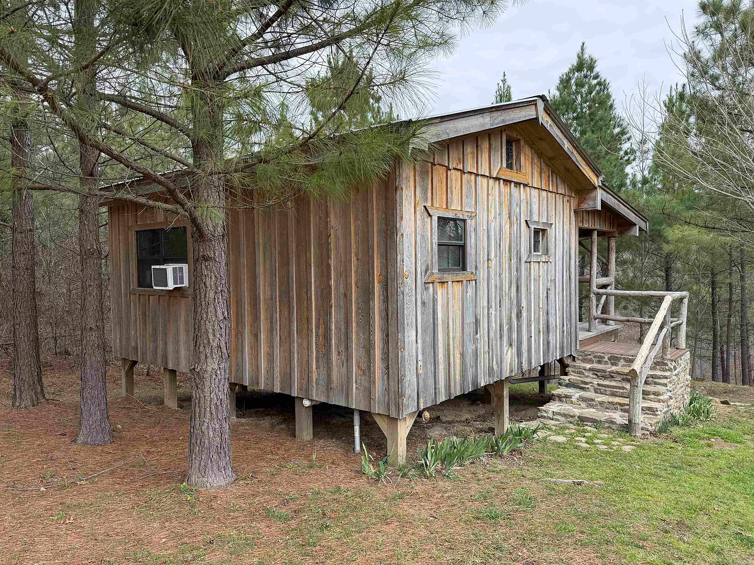 This property stands out immediately due to its setup. While the main cabin is 667 sqft, the additional buildings expand the living and usable space significantly.