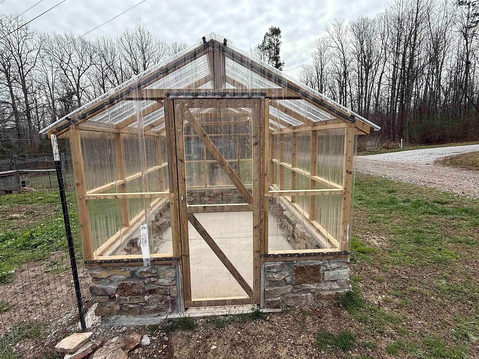 It includes a greenhouse, fenced garden, chicken coop, and livestock area.