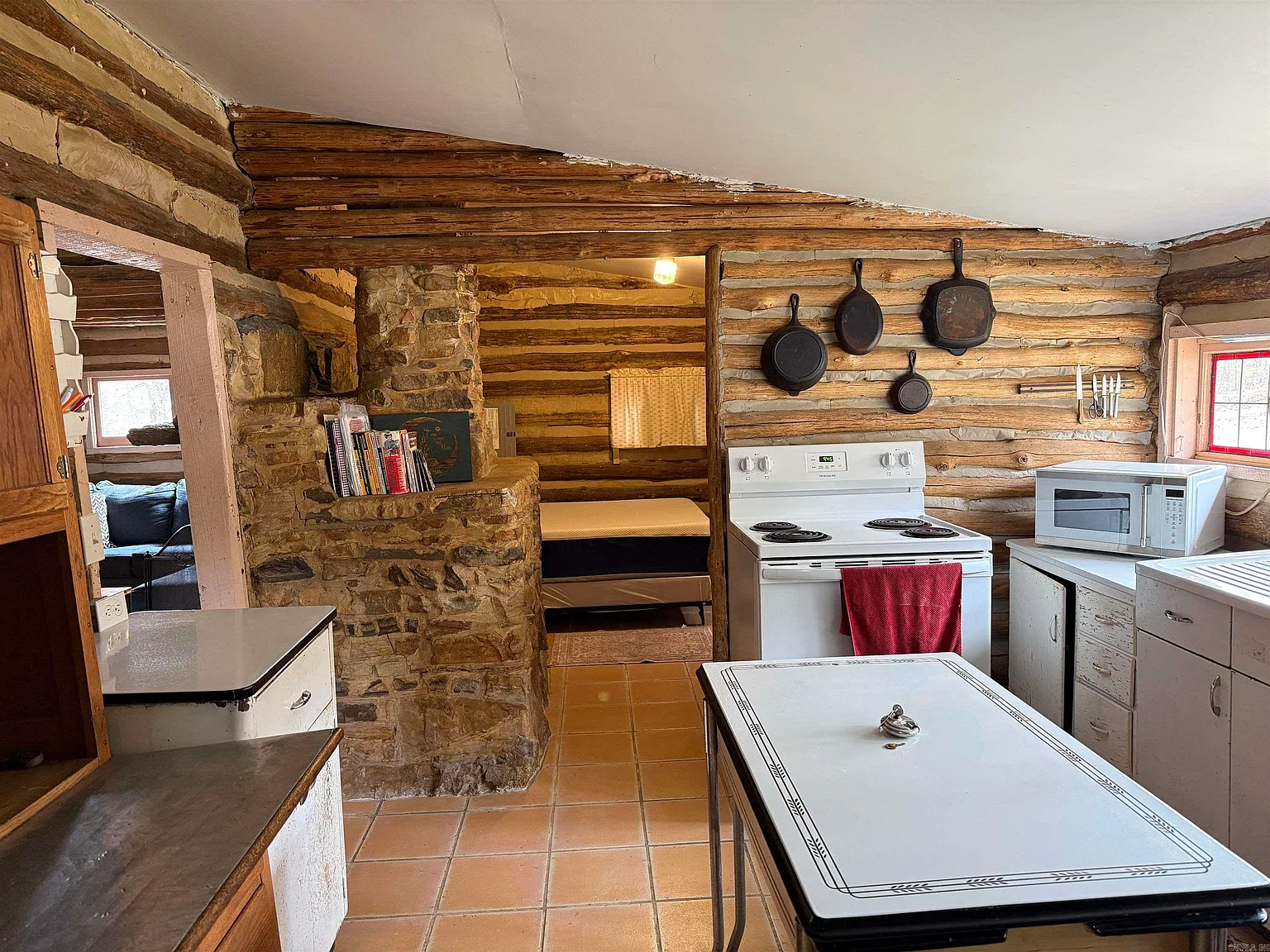 The main home is a log cabin designed for heat efficiency, featuring a rock fireplace and rustic construction.
