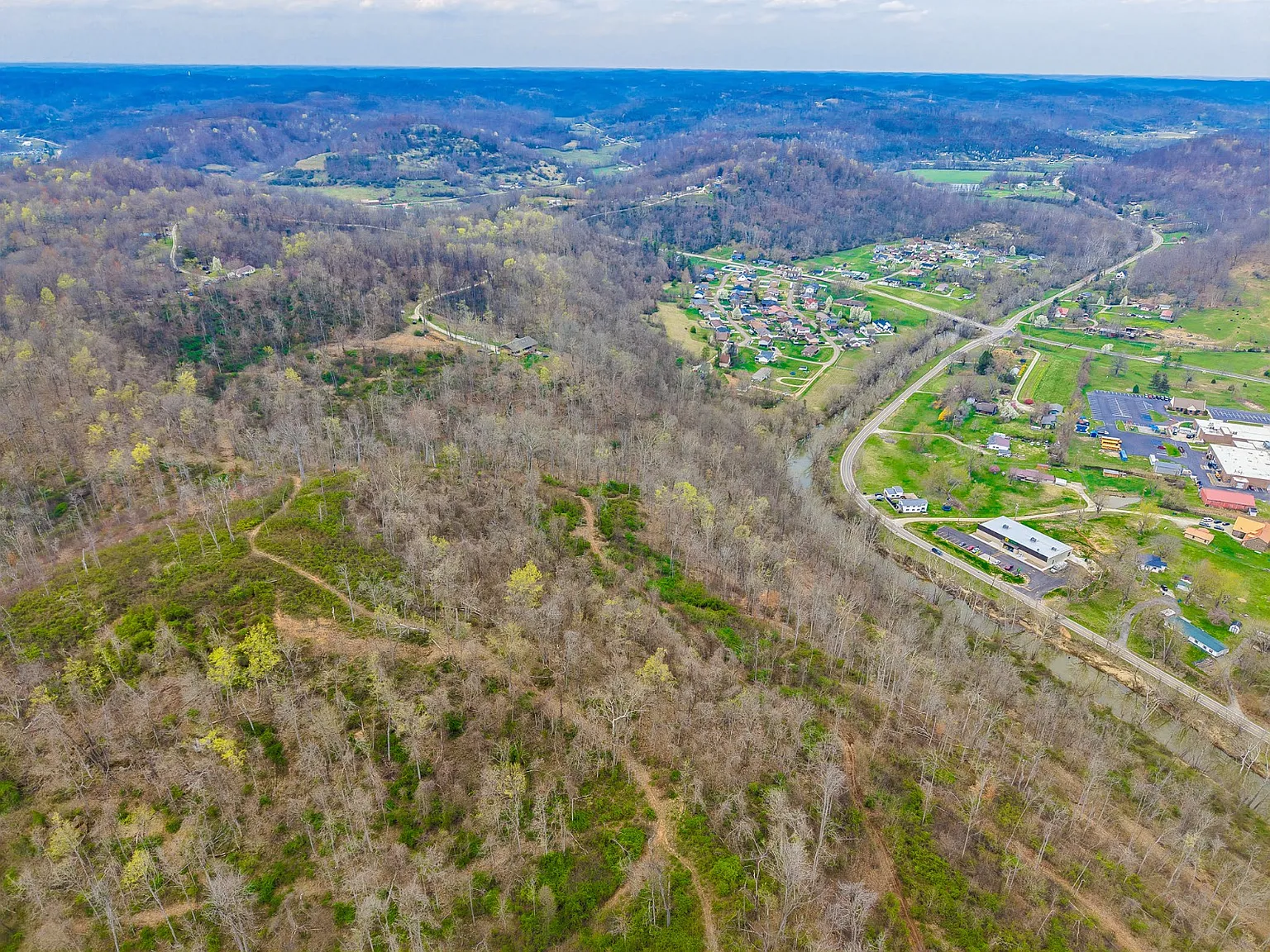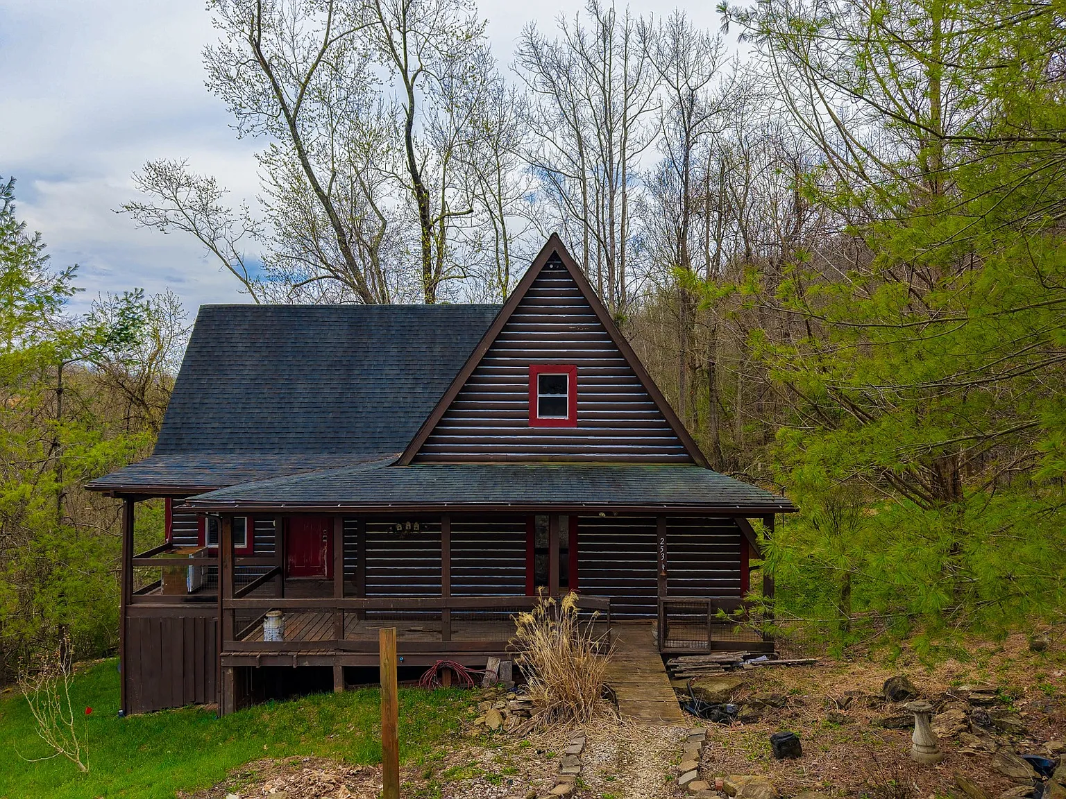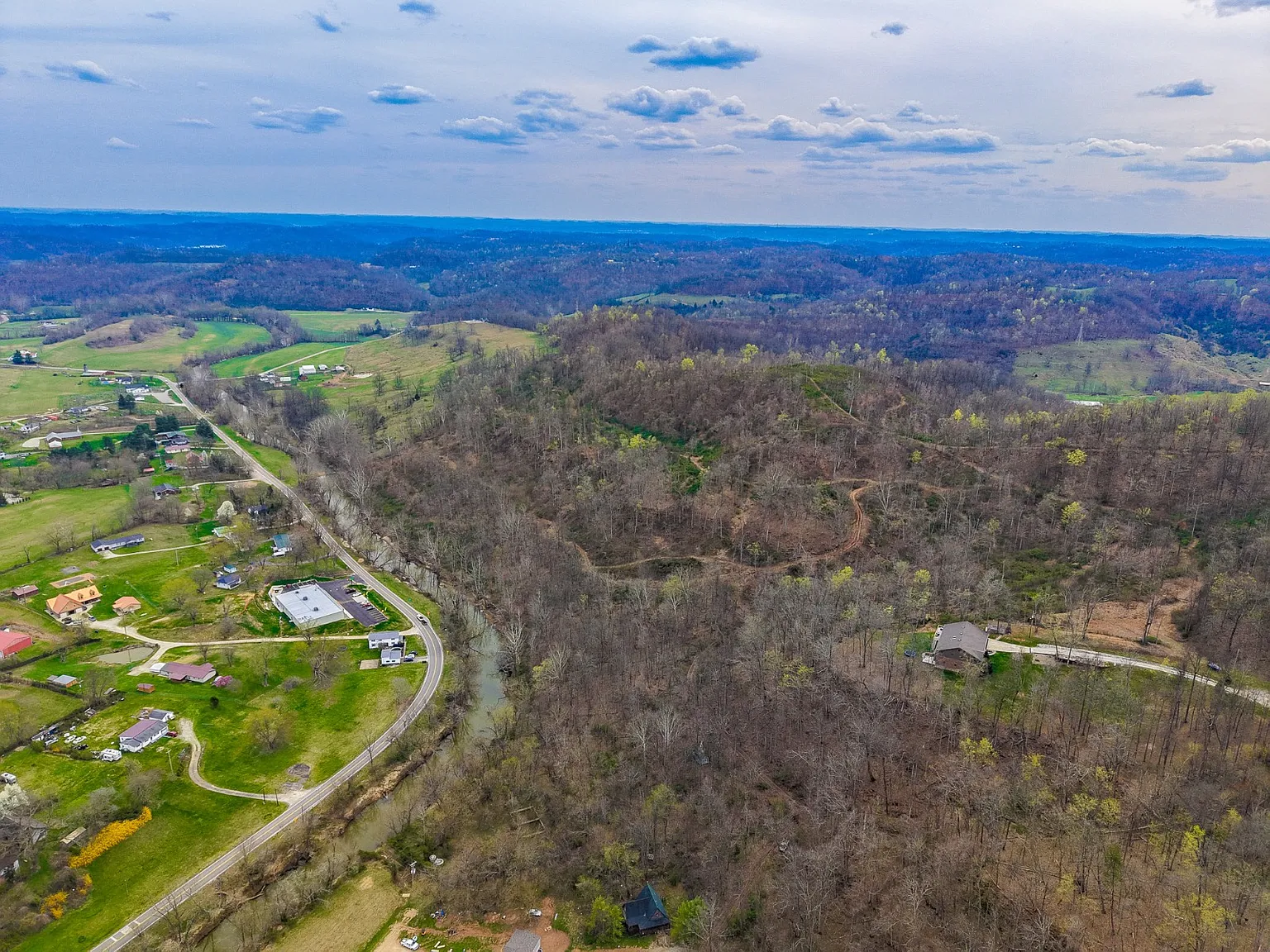 Nestled at the end of a quiet road outside Chesapeake, on 253 Township Road 157 in South Point, Ohio, this rustic log home sits on an incredible 44.7-acre lot of rolling Ohio countryside. Developed in 1980, the home offers 1,336 square feet of living space, combining privacy, natural beauty, and endless outdoor potential. Inside, you’ll find a simple and charming layout featuring two large bedrooms, one full bathroom, and a cozy living area anchored by warm wood tones throughout. Recent updates have been made, but there is still room for a personal finishing touch. The outside land offers endless potential for recreation and hobbies, with nearly 900 feet of frontage along the scenic Symmes Creek, providing direct access to fishing, kayaking, and wildlife watching. A recent timber cut encouraged thick brush growth, creating ideal cover for turkey and deer, making it excellent for hunting. Rolling hills and reopened trails invite exploration by foot, e-bike, ATV, or 4×4, making this a true playground for nature lovers. Conveniently located in a peaceful setting, yet close to essentials, local stores, gas stations, and the Collins Career Center, the property feels secluded but is not far from whatever you need. Whether seeking a weekend escape, a hunting base, or a quiet place to settle, this creekside property delivers unmatched space and opportunity. Schedule your private showing today and experience its natural beauty and endless potential firsthand!