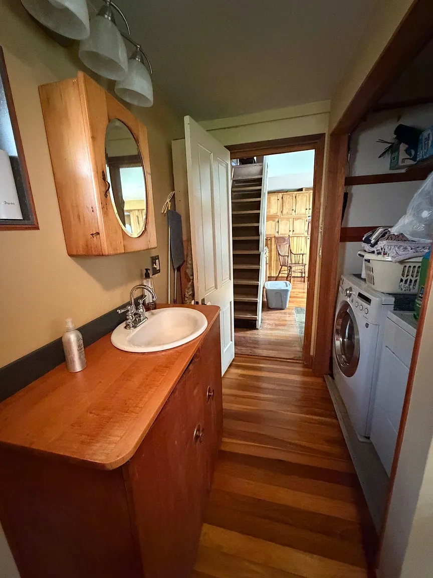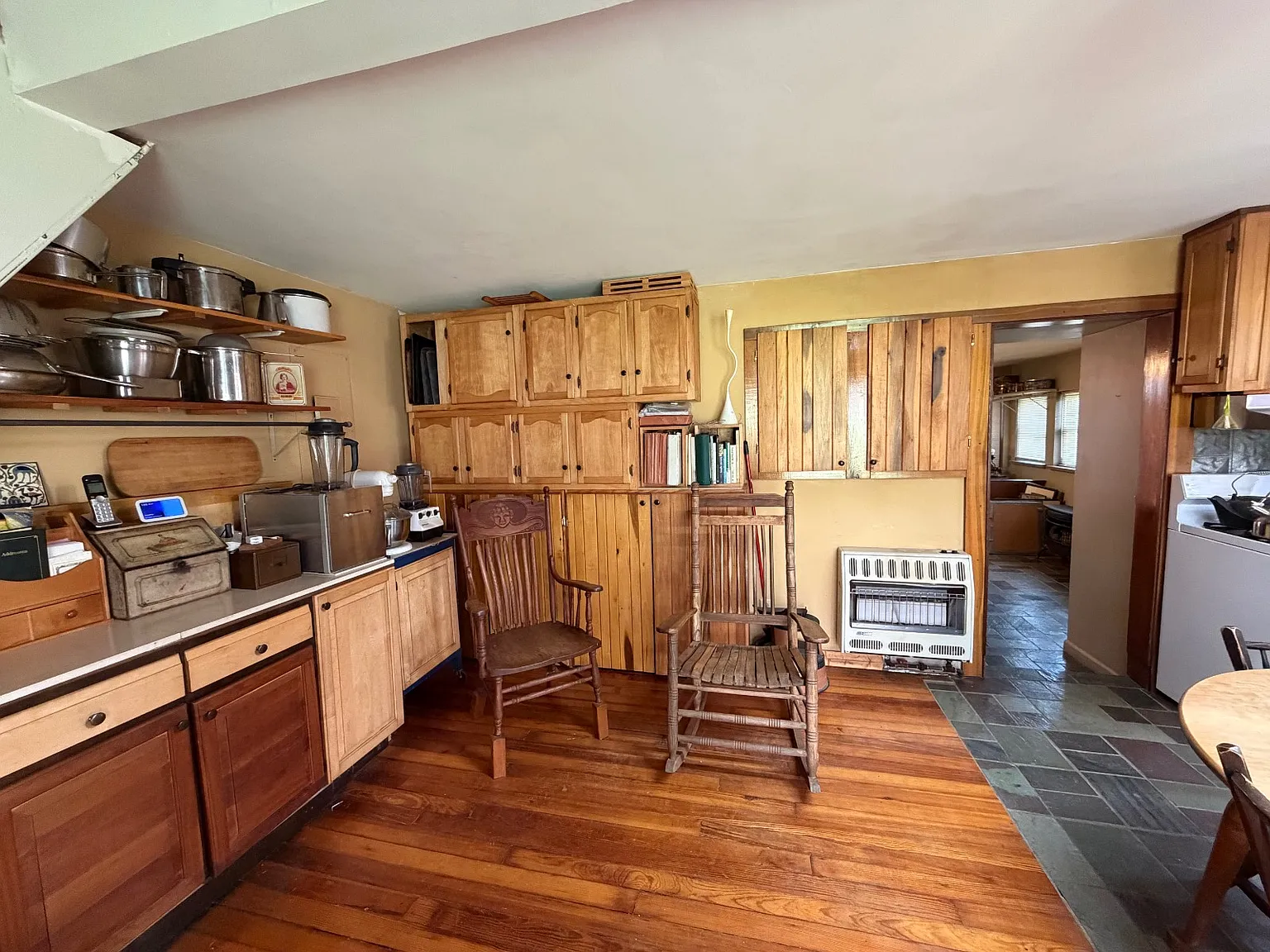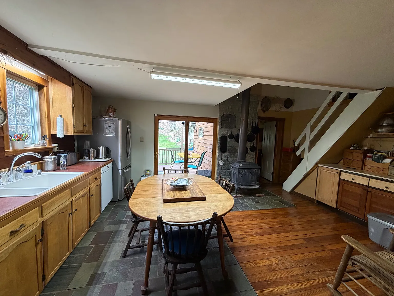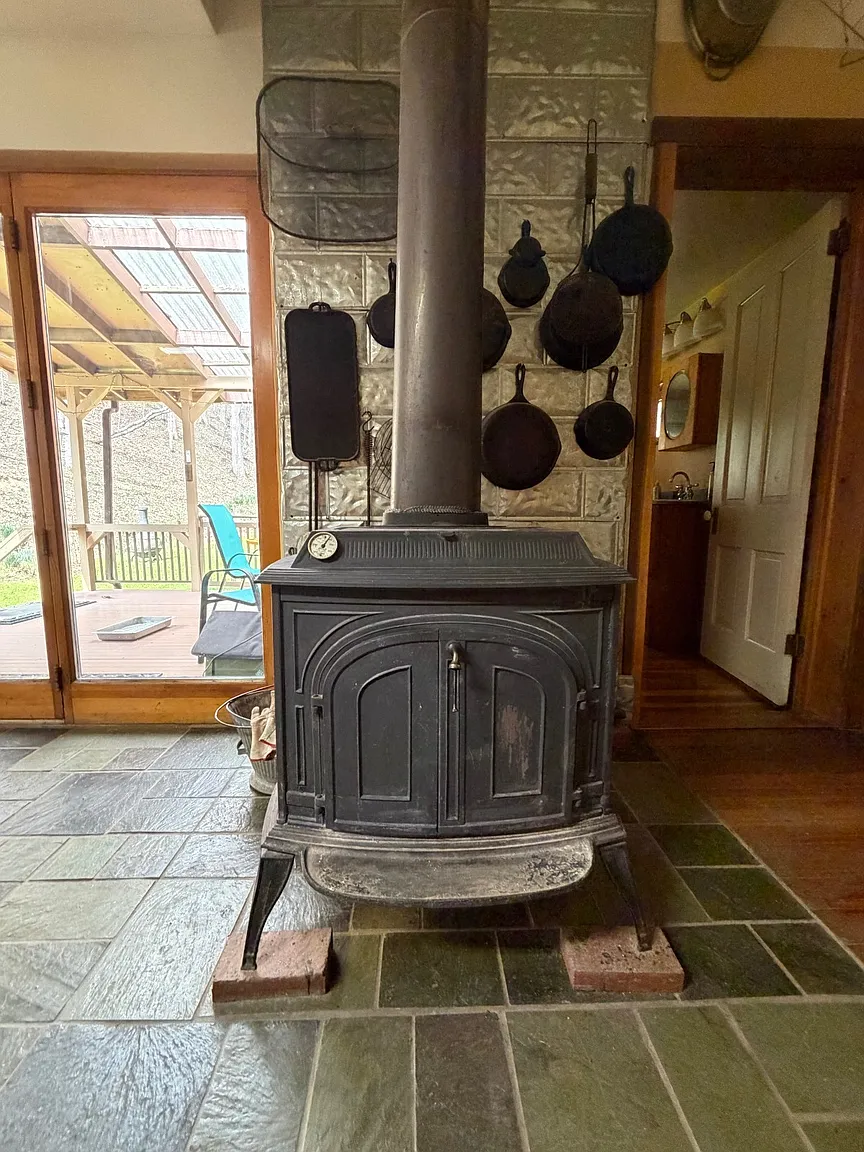The home is primarily heated by a wood-burning stove, offering efficiency and independence.