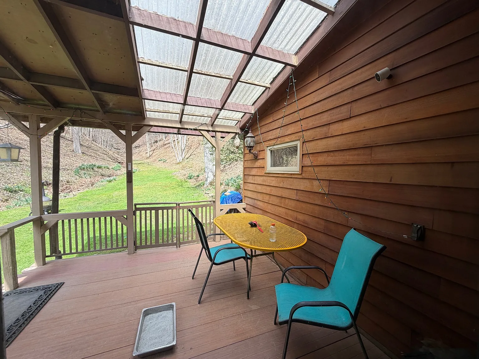 The covered back porch with a clear roof is a standout feature.