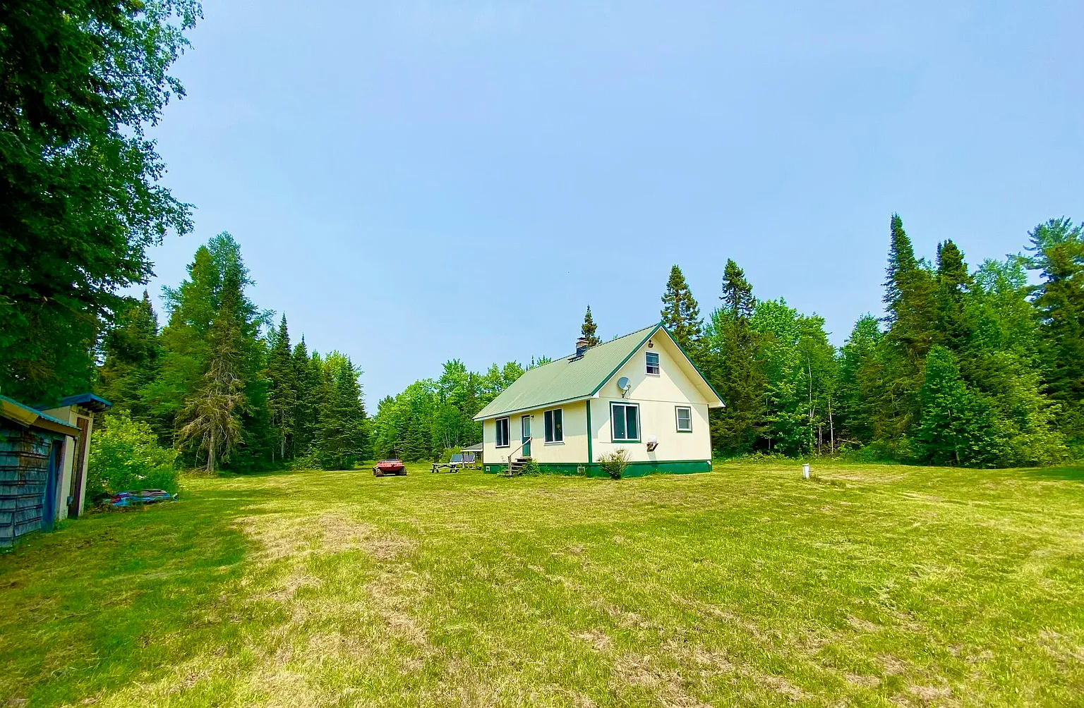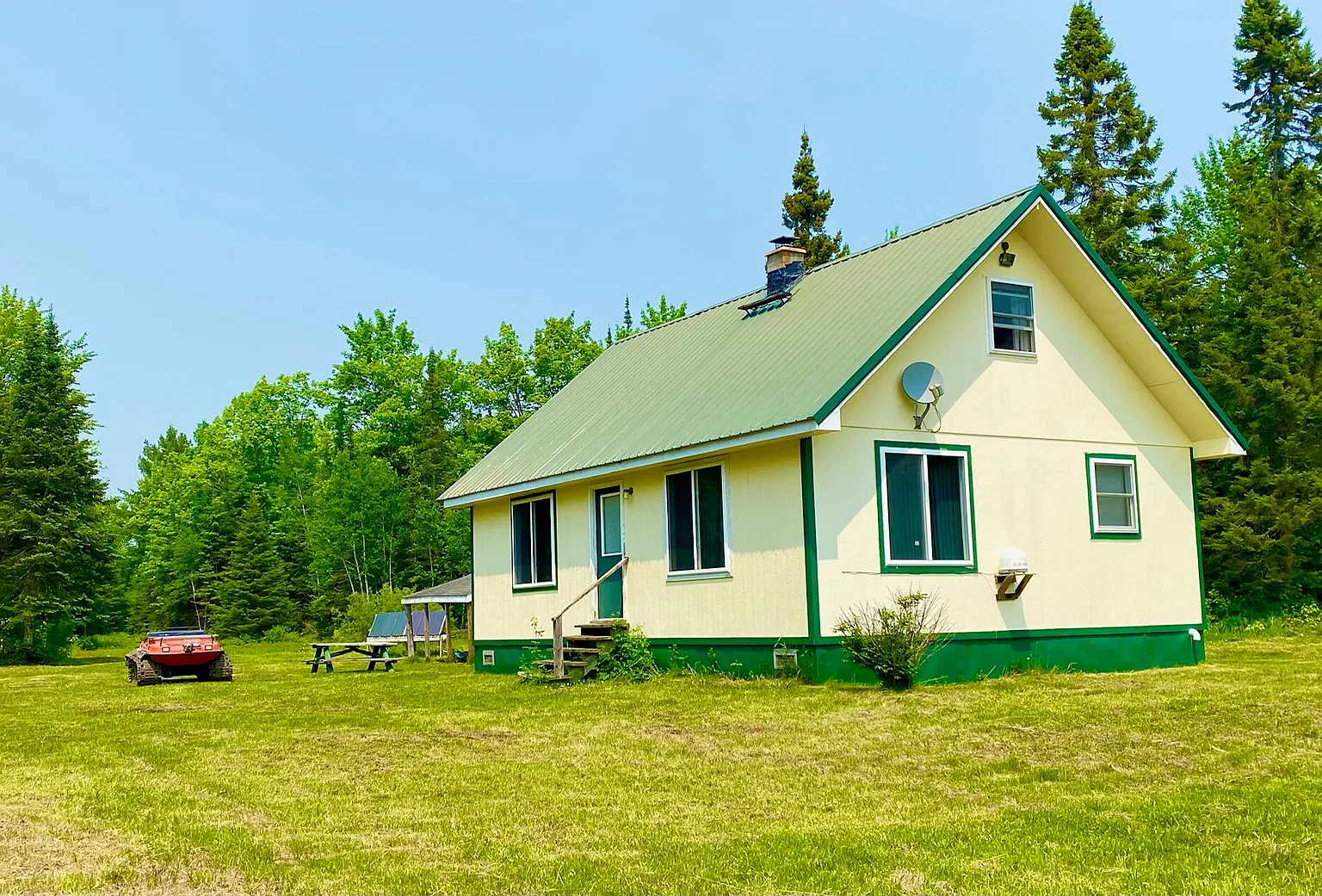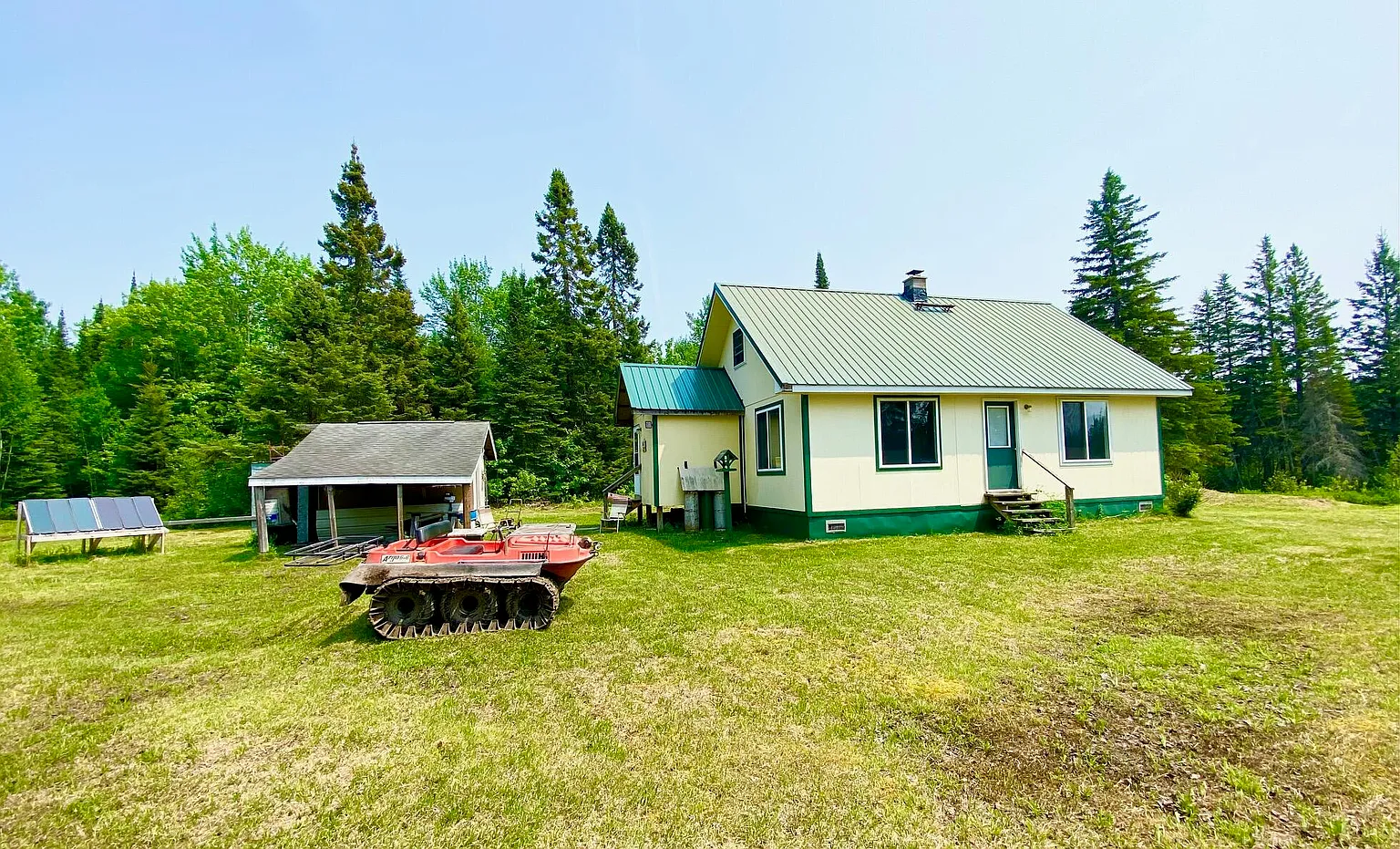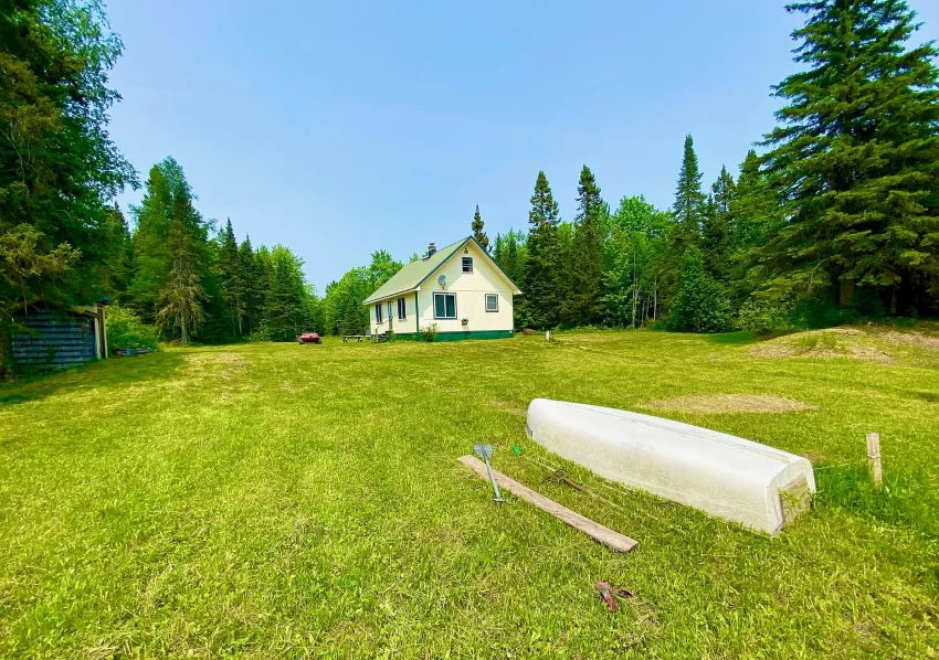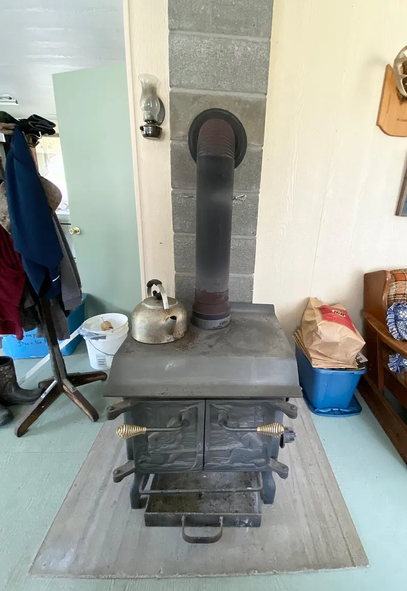 Water is handled with a 5″ flowing well providing fresh water, plus indoor plumbing. Power comes from a Honda generator, and the cabin includes both a wood stove and a wall furnace for warmth through fall and winter. The listing is truly turn key, with furnishings, linens, appliances, a solar array, and even a boat with outboard motor included.