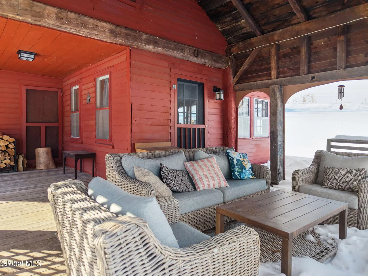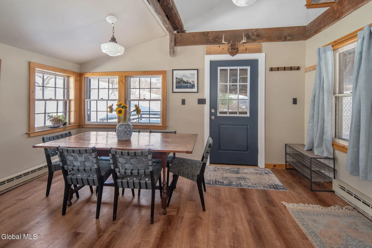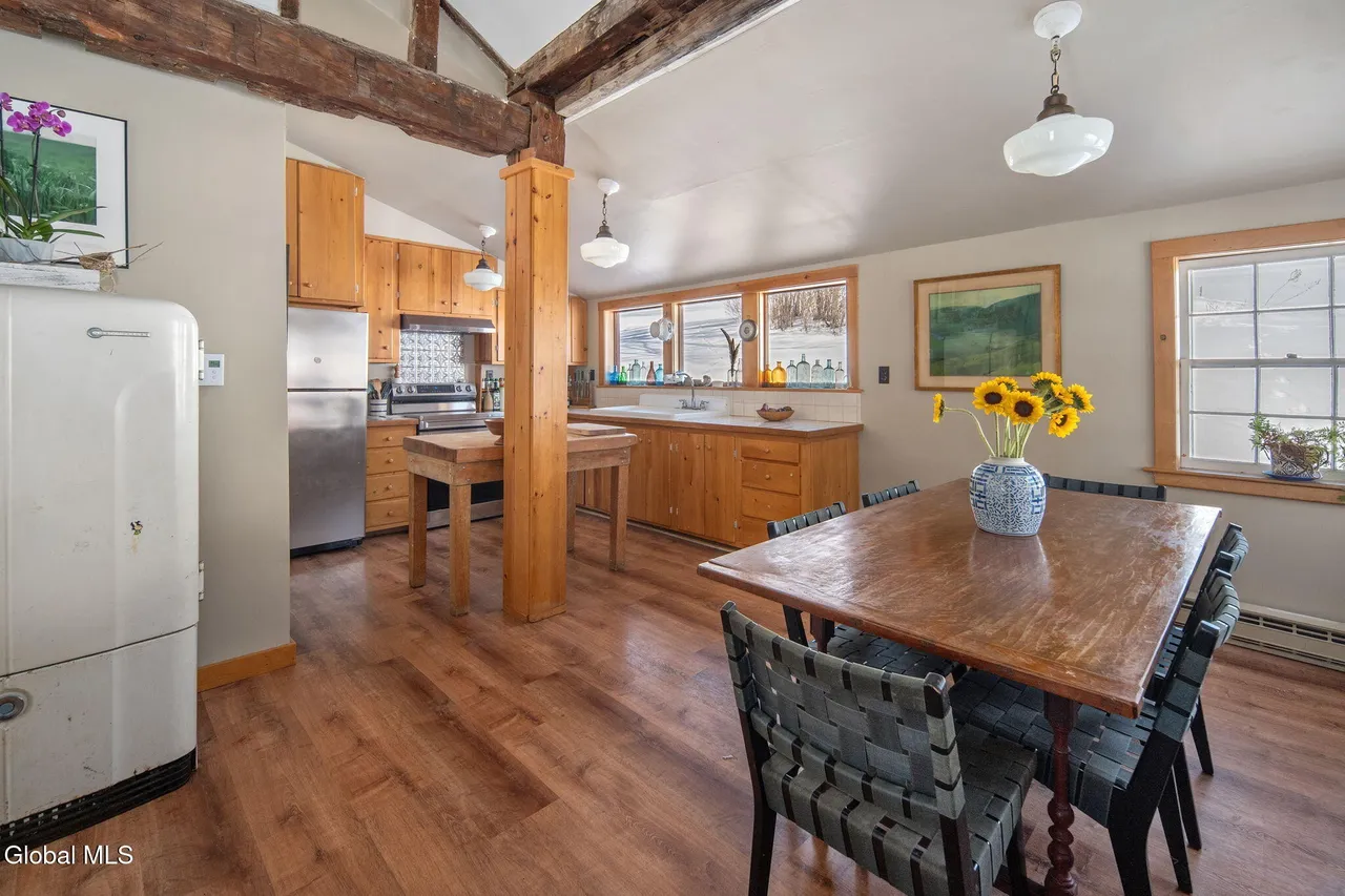 Features include exposed wood beams, original wood flooring, sun-filled rooms, and a cozy fireplace that anchors the main living area.
