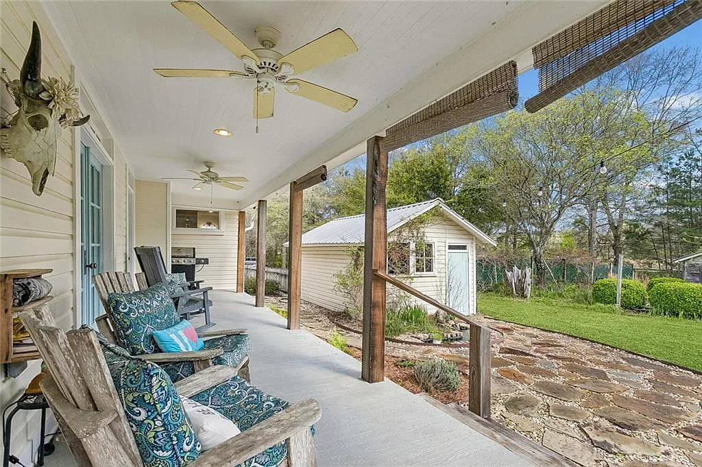 One of the standout features of this property is its outdoor living space. The expansive porch with custom cypress posts creates a perfect place to relax and enjoy the surroundings.