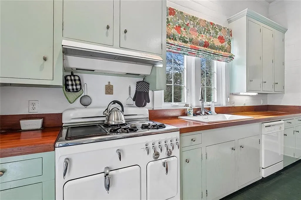 Inside, the home offers a warm and functional layout. The kitchen features a stone island, butcher block countertops, and a farmhouse sink, combining style and practicality.