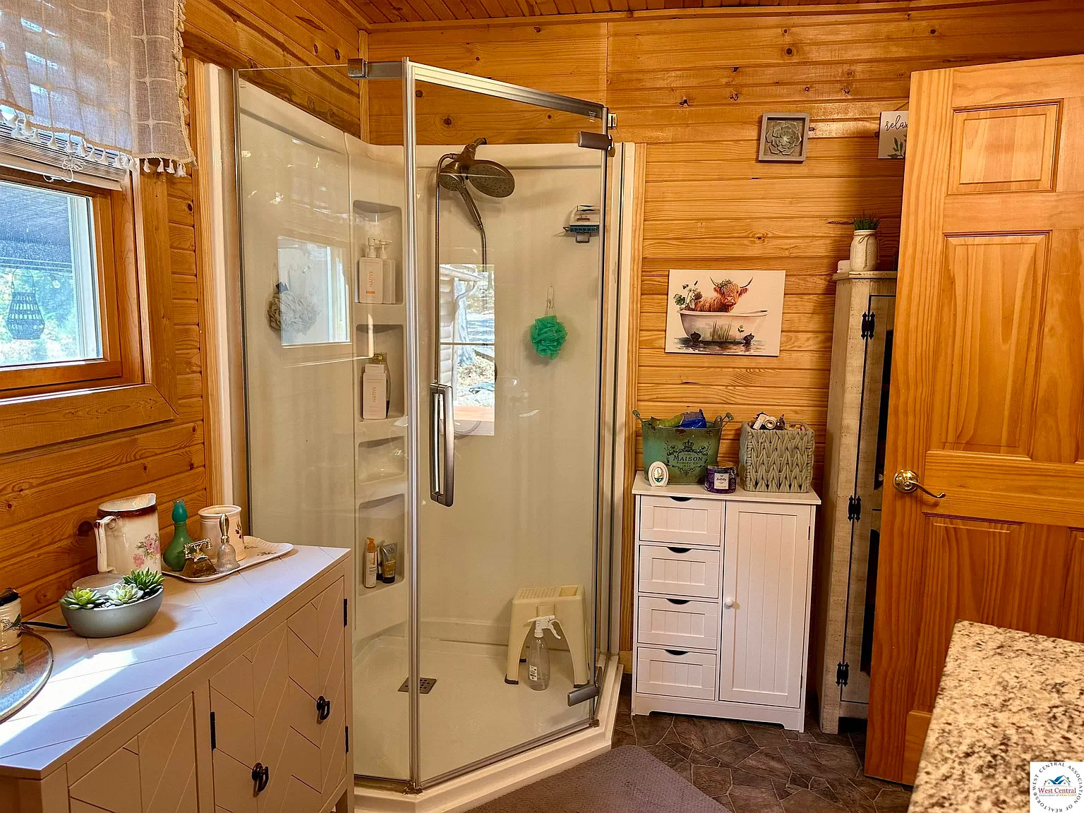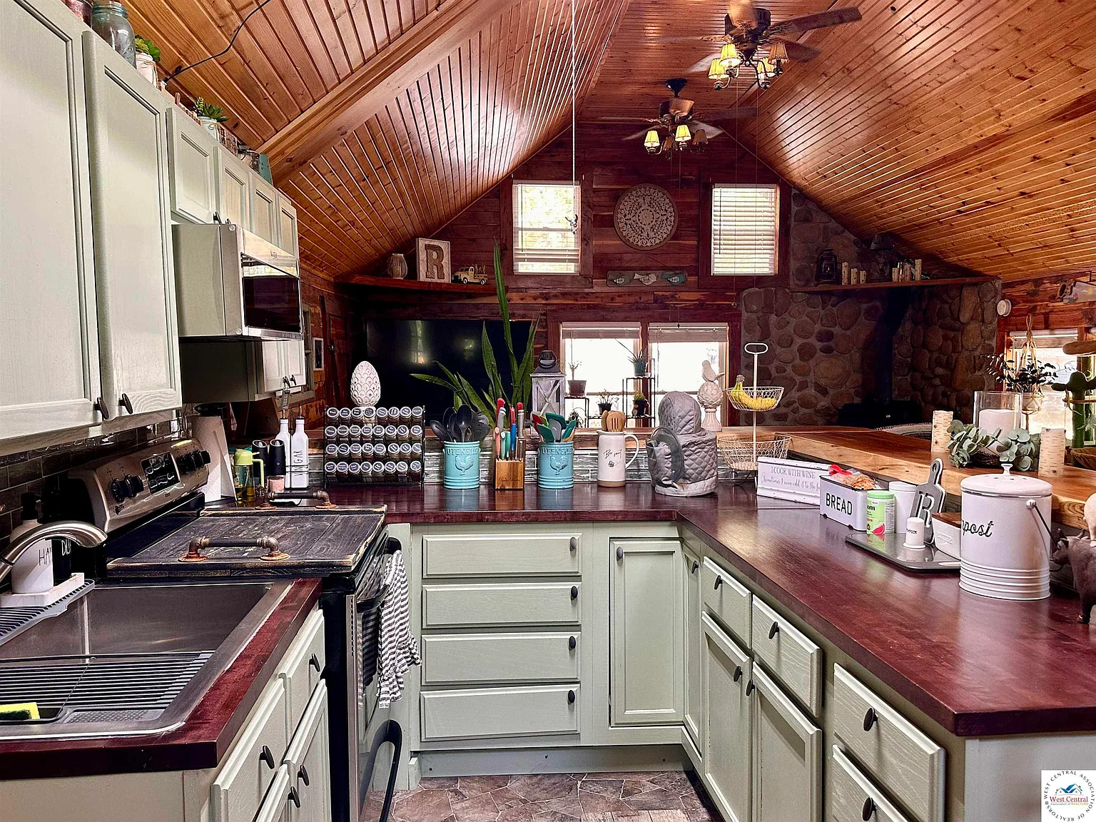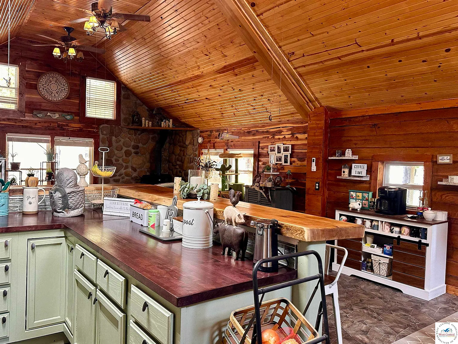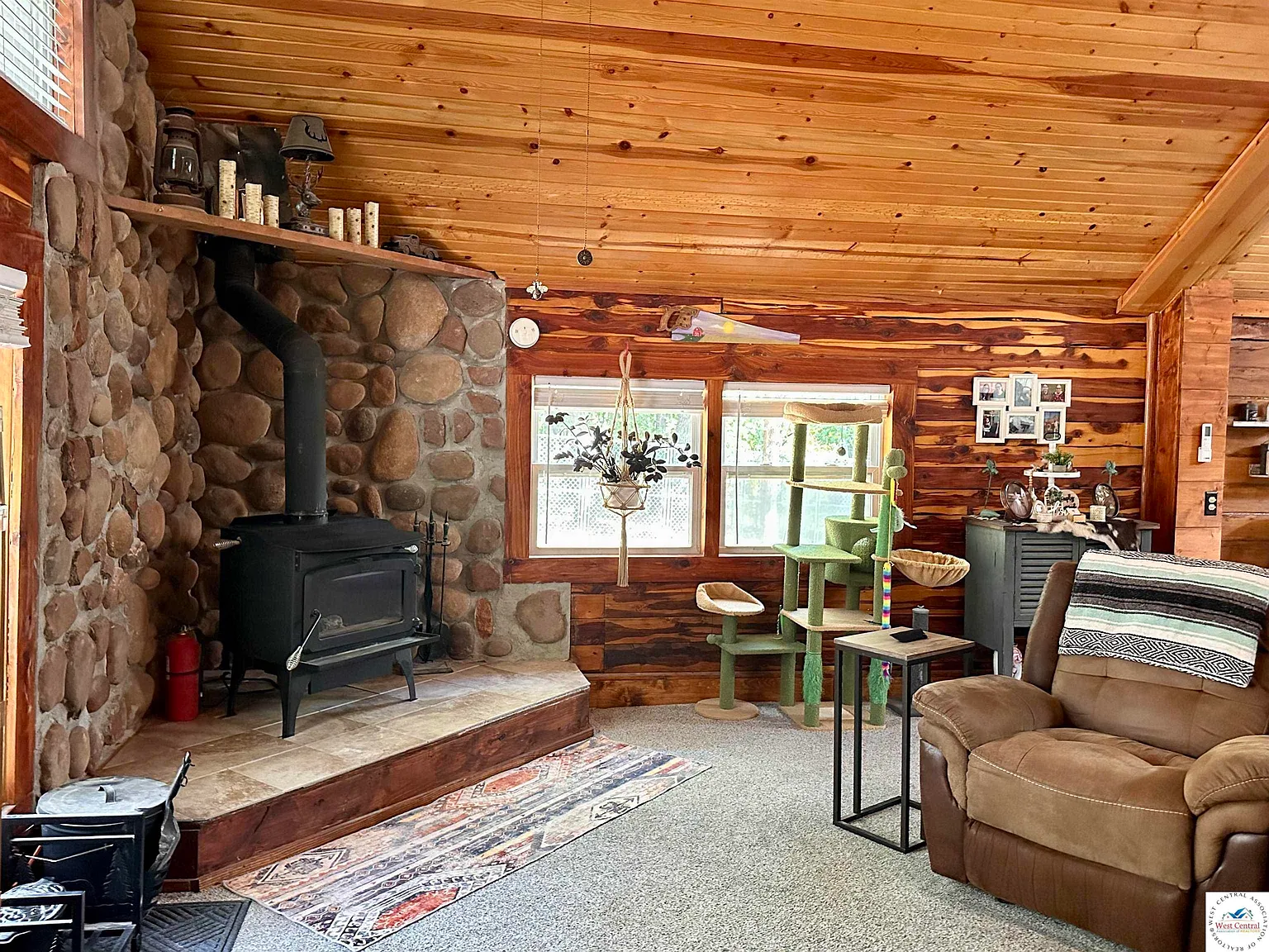 Built in 2008, the custom log cabin features 1 bedroom and 1 bathroom with about 1,370 square feet of living space. The interior offers a warm, open layout with vaulted wood ceilings, a large kitchen and living area, stainless appliances, and a wood stove that adds to the cozy cabin atmosphere. Wrap-around porches provide beautiful views of the pond and wooded surroundings.