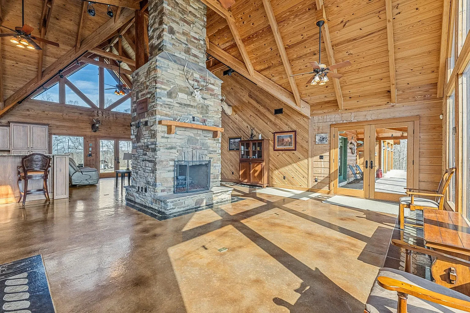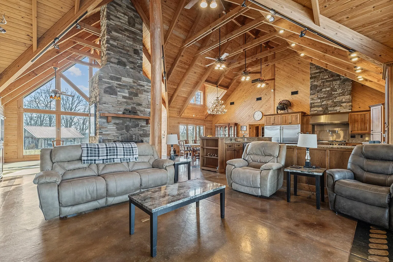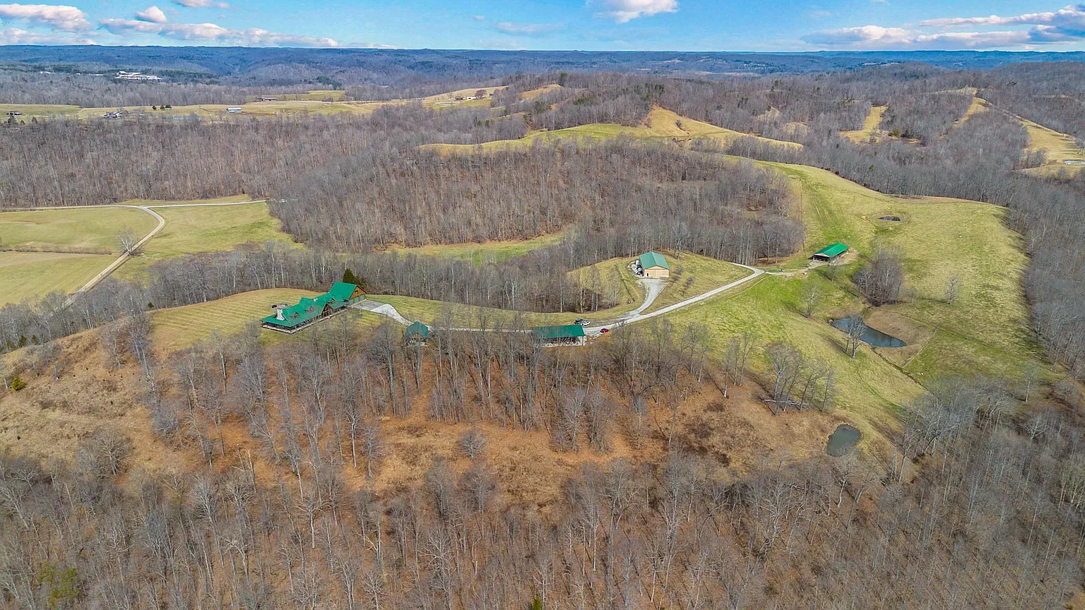 Set behind a gated private entrance in Grayson, Kentucky, on 572 Clydesdale Drive, this 321.5-acre estate delivers a rare combination of refined luxury and fully functional agricultural operations. At its heart sits a striking 5,118-square-foot log home built in 2007, offering five spacious bedrooms and four full bathrooms, thoughtfully designed to balance grandeur with everyday livability. Inside, you’ll find soaring 25-foot ceilings, floor-to-ceiling windows, and heated floors throughout, creating an open, light-filled environment with uninterrupted views of the surrounding land. A dramatic dual-sided stone fireplace anchors the main living space, while additional fireplaces add warmth and character throughout the home. The gourmet kitchen is outfitted with professional-grade appliances, including a gas range, double oven, refrigerator, and expansive prep and dining areas ideal for gatherings both large and small. Geothermal heating and cooling provide year-round efficiency, and the home includes multiple laundry areas for added functionality. The primary suite serves as a private retreat with its own stone fireplace, spa-style bathroom, dual vanities, oversized walk-in closets, and direct access to the wrap-around porch. Additional bedrooms on the main level and upper level provide flexibility for guests or extended living. A four-car attached garage with heated floors further enhances convenience and utility. The estate is fully equipped for cattle operations with six barns, automatic waterers, rolling fenced pastures, and nine ponds spread across the property. A creek and pond frontage add natural beauty, while wooded and cleared acreage offer balance and versatility. With its scale, infrastructure, and craftsmanship, this property stands as a once-in-a-generation opportunity to own a luxury residence. Don’t miss the opportunity to make it yours – schedule a private showing today!