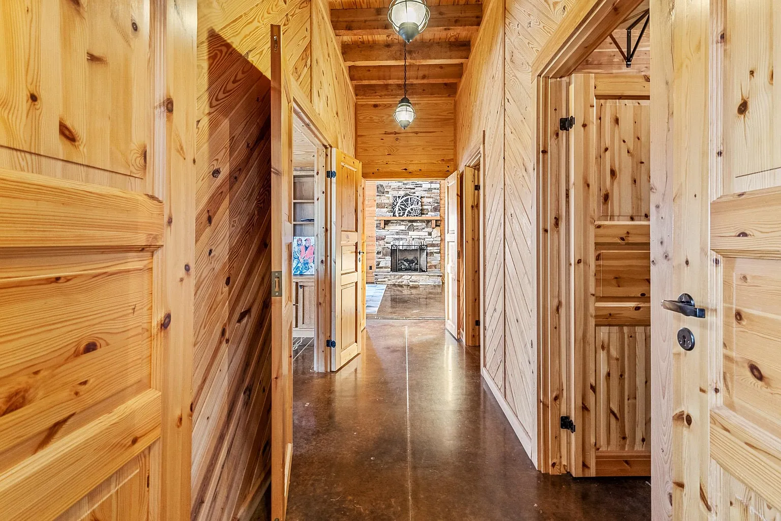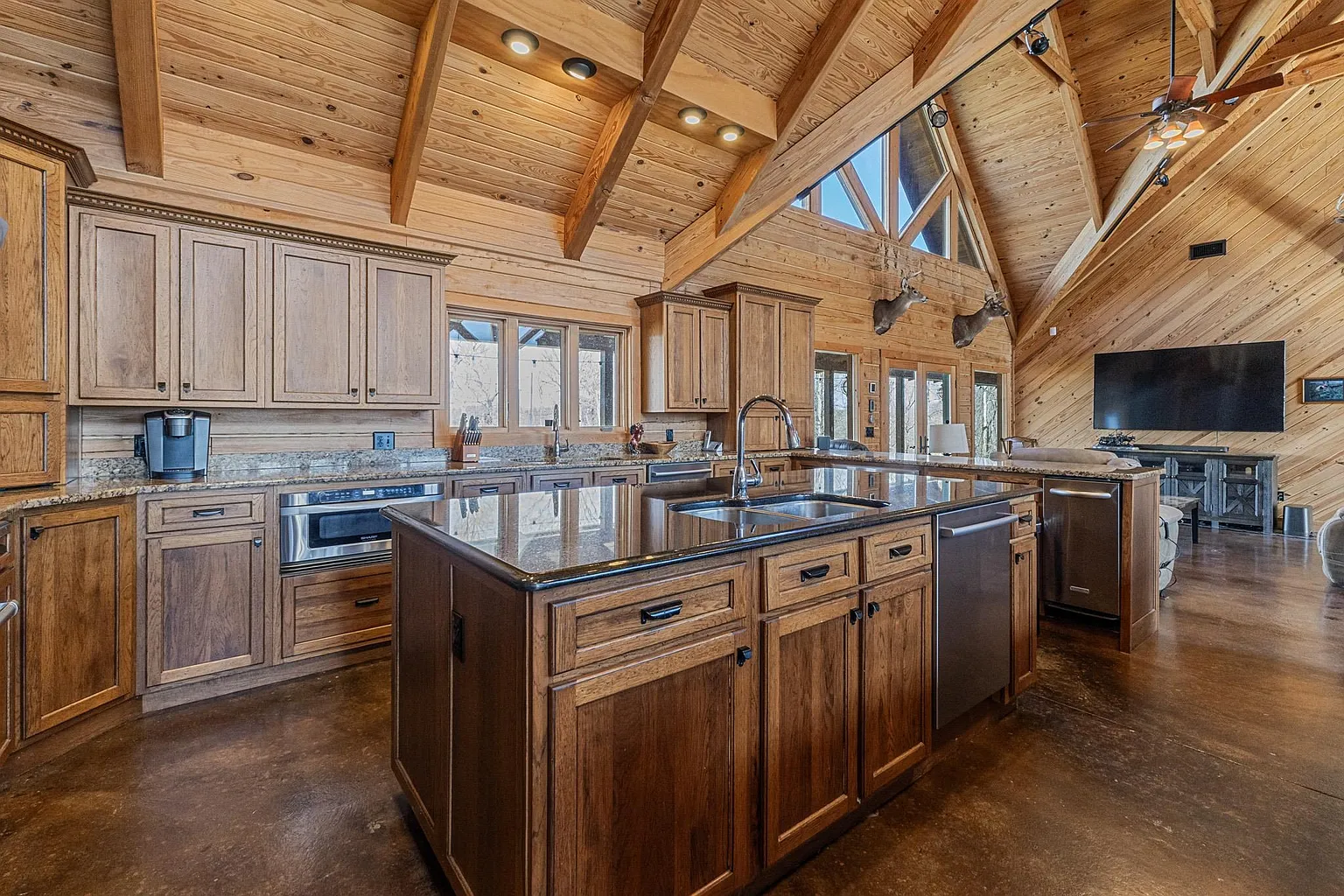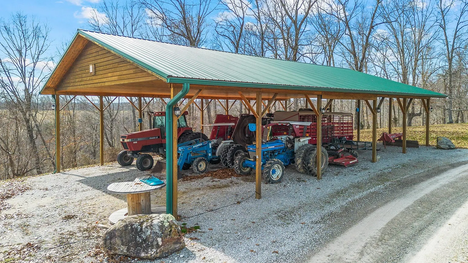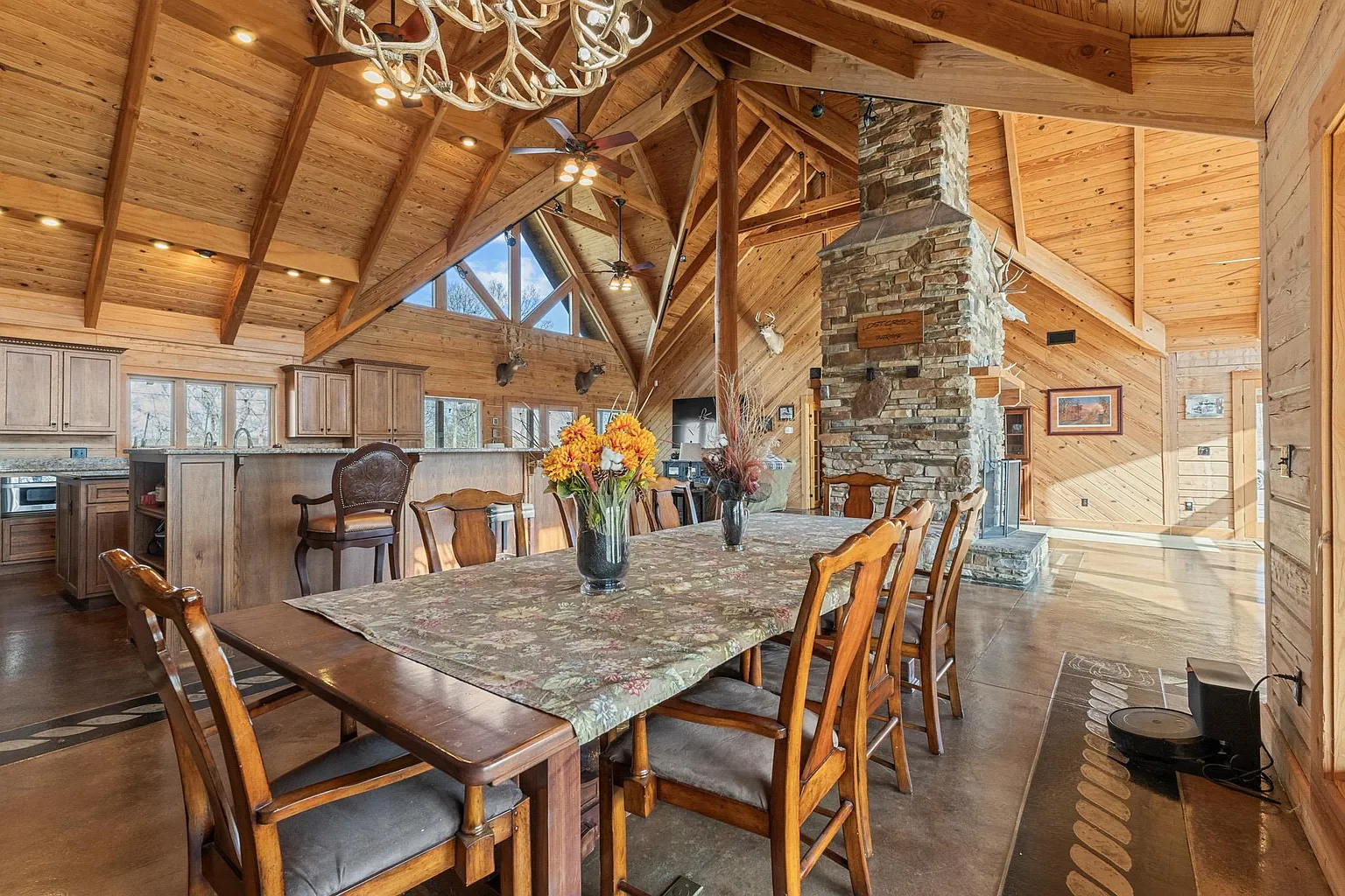 Set behind a gated private entrance in Grayson, Kentucky, on 572 Clydesdale Drive, this 321.5-acre estate delivers a rare combination of refined luxury and fully functional agricultural operations. At its heart sits a striking 5,118-square-foot log home built in 2007, offering five spacious bedrooms and four full bathrooms, thoughtfully designed to balance grandeur with everyday livability. Inside, you’ll find soaring 25-foot ceilings, floor-to-ceiling windows, and heated floors throughout, creating an open, light-filled environment with uninterrupted views of the surrounding land. A dramatic dual-sided stone fireplace anchors the main living space, while additional fireplaces add warmth and character throughout the home. The gourmet kitchen is outfitted with professional-grade appliances, including a gas range, double oven, refrigerator, and expansive prep and dining areas ideal for gatherings both large and small. Geothermal heating and cooling provide year-round efficiency, and the home includes multiple laundry areas for added functionality. The primary suite serves as a private retreat with its own stone fireplace, spa-style bathroom, dual vanities, oversized walk-in closets, and direct access to the wrap-around porch. Additional bedrooms on the main level and upper level provide flexibility for guests or extended living. A four-car attached garage with heated floors further enhances convenience and utility. The estate is fully equipped for cattle operations with six barns, automatic waterers, rolling fenced pastures, and nine ponds spread across the property. A creek and pond frontage add natural beauty, while wooded and cleared acreage offer balance and versatility. With its scale, infrastructure, and craftsmanship, this property stands as a once-in-a-generation opportunity to own a luxury residence. Don’t miss the opportunity to make it yours – schedule a private showing today!