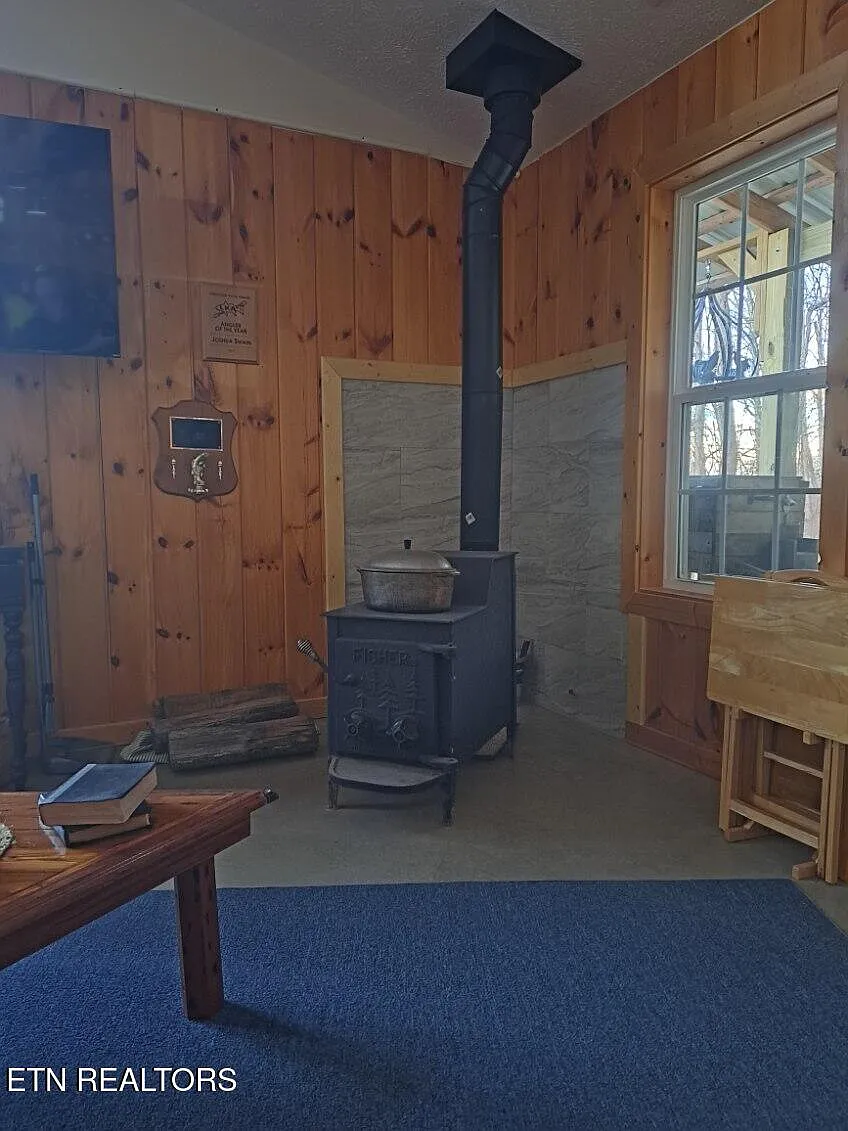 The living room includes a wood stove, and a gas line is already installed if the new owner prefers to convert it to a gas log fireplace.
