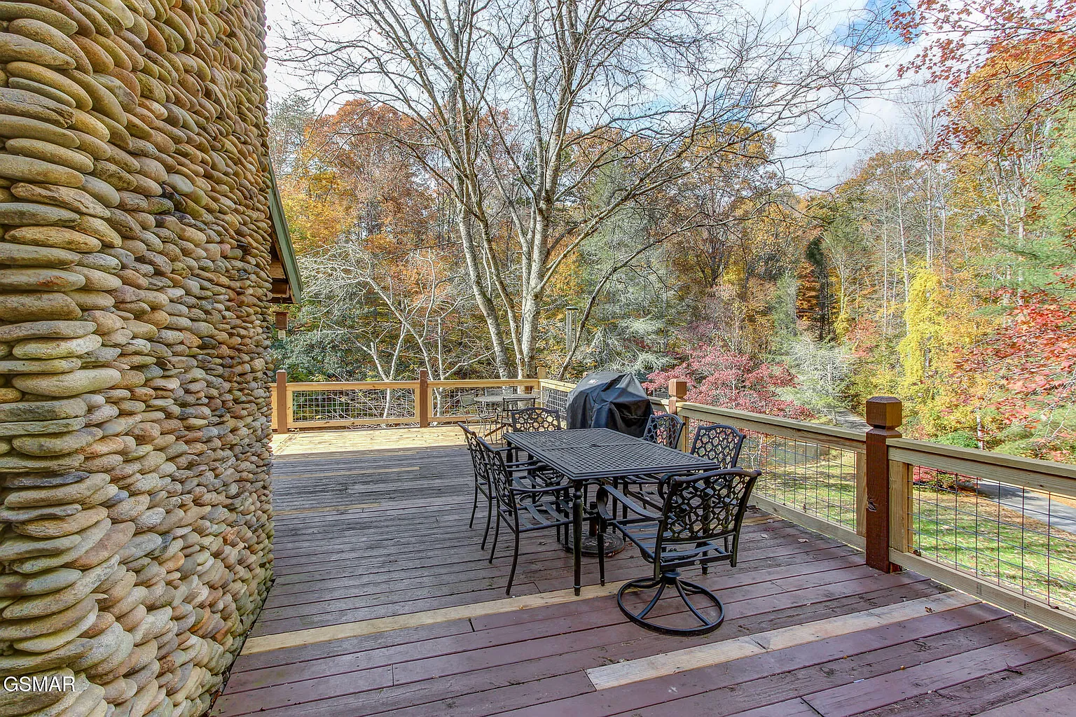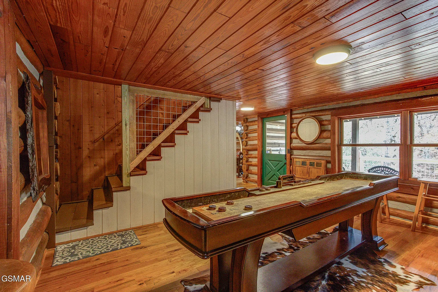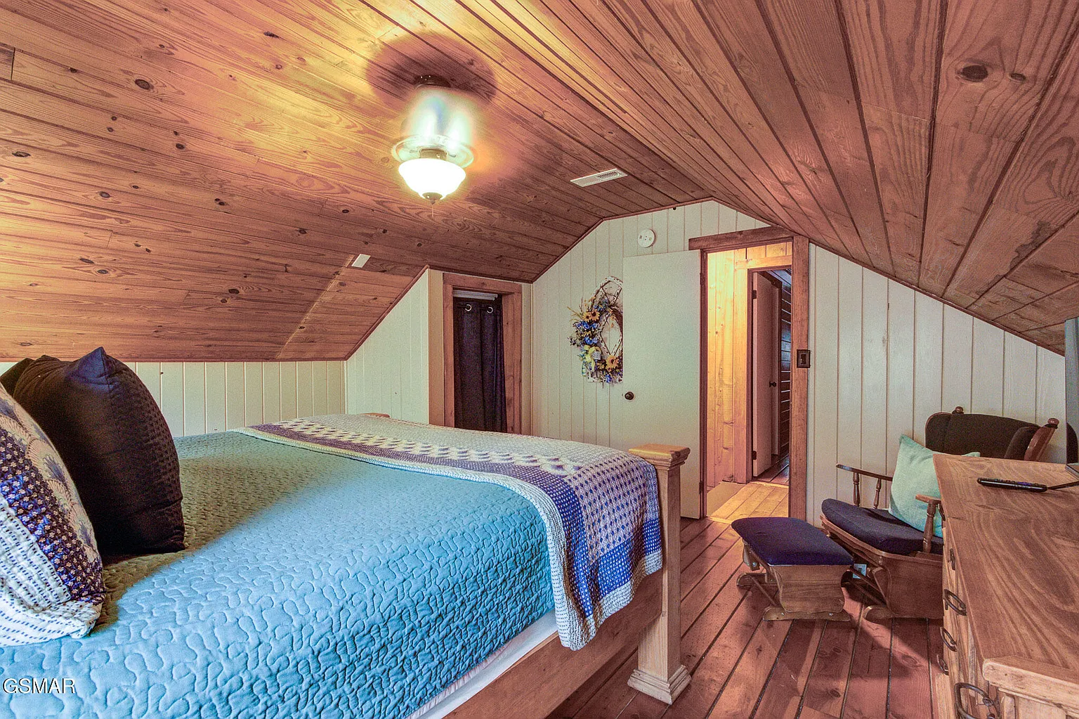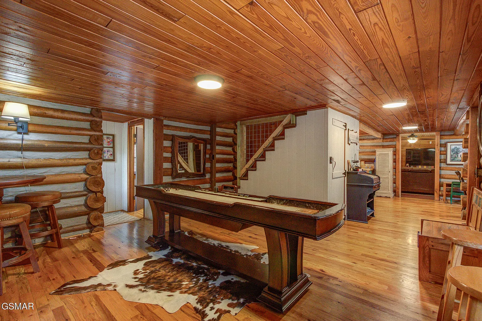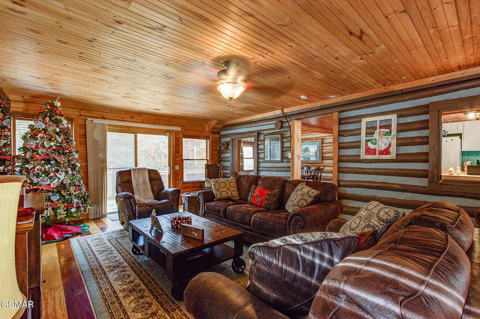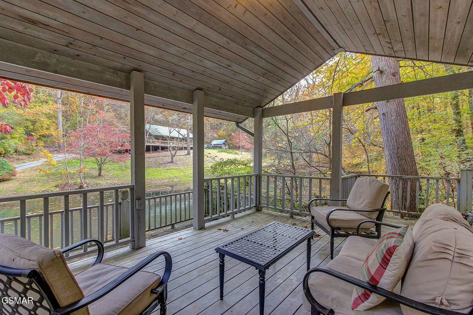 Nestled in the quiet Smoky Mountain Landscape, this 11.3-acre property at 1049 Alpine Road in Seymour, Tennessee, comes with a rustic log cabin graced with character, comfort, and ample space for recreation. Developed in 1979, the rustic cabin is set at the center of the property overlooking a spring-fed, stocked pond. Inside, the spacious layout offers 2,224 square feet of living space, featuring two bedrooms, four baths, a bright living room framed by large windows, a farmhouse-style kitchen, and a dining alcove beneath a vaulted, beamed ceiling. A cozy family room anchors the space with its woodstove-insert fireplace and full-size shuffleboard table, and a beautifully tiled full bath completes the floor. Upstairs, the two king bedrooms sit on either side of a central hallway, sharing a full bath with a vessel sink and tiled tub/shower. The lower level extends your options with a bonus queen room, a laundry area with a built-in bunk nook, and a third full bath featuring a luxe doorless shower. Outdoors, the half-wrap deck delivers a true mountain retreat experience with its hot tub, covered swing area, and dining space overlooking the pond and surrounding woods. Across the parking area, a charming guest cottage built from vintage logs adds even more flexibility, offering a king bed, breakfast area, and a bath with a clawfoot soaking tub. A short walk around the pond leads to a footbridge and a gazebo perfectly placed for quiet mornings and sunset views. Conveniently located just minutes from town and within easy reach of Pigeon Forge and Sevierville, this unique property is a perfect opportunity for anyone seeking a primary home, a natural retreat, or a successful rental. Don’t miss the chance to make it yours for a captivating price – schedule your private showing today!