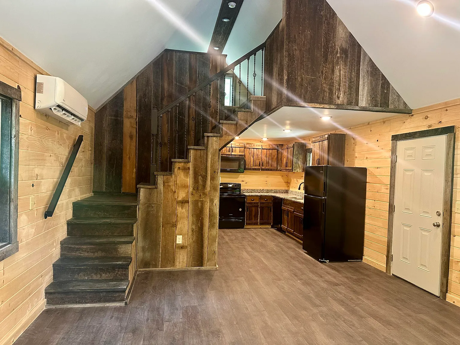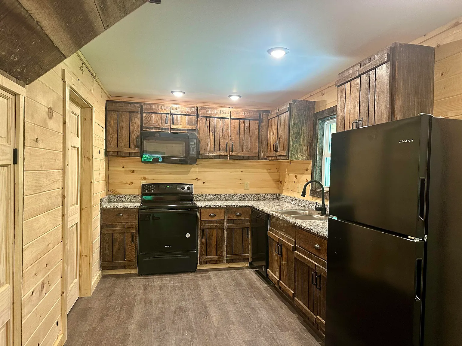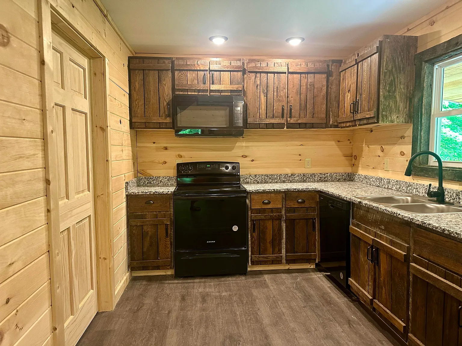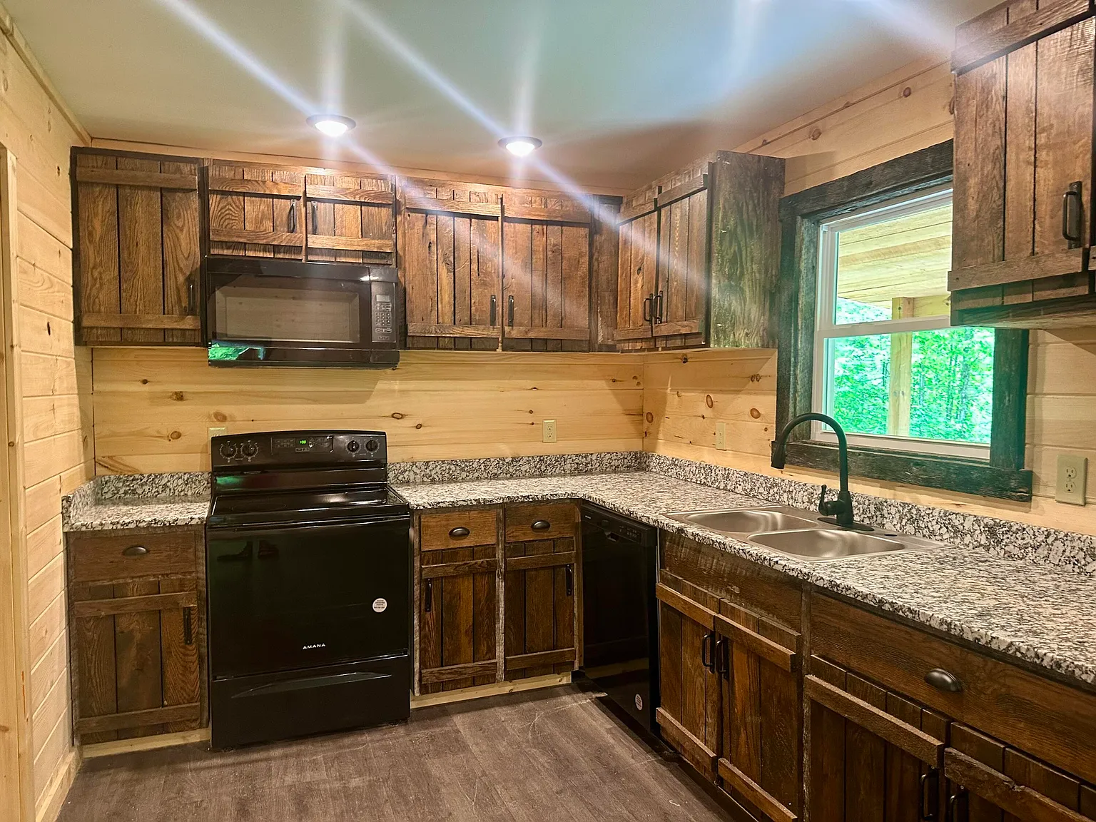 Nestled deep in the woods on 1807 Baldwind Road 7 in McKee, Kentucky, this brand-new 2025 cabin set on 8.78 acres offers a tranquil setting overlooking the North Fork of the Rockcastle River, delivering rustic charm and modern craftsmanship. Inside, the layout offers 600 square feet of living space featuring one spacious bedroom and one full bathroom, a warm and inviting atmosphere, barn-wood finishes, and vaulted ceilings. The living area flows into the kitchen with custom-made rustic cabinets, granite countertops, and appliances, including a refrigerator, a stove, a microwave, and a dishwasher. The main-level bathroom includes a shower, laundry area, and simple, practical finishes. Outside, you’ll find a full front porch where the view stretches across the treetops toward the river, offering the perfect spot to drink coffee, read, or just listen to the sounds of nature. The property’s 8+ acres are wooded and secluded, teeming with wildlife like deer and wild turkey. There’s even a campsite setup with electric and water hookups (30 & 50 amp) for guests or an RV. With public water, electricity, and a private septic system already in place, this cabin is move-in ready and low maintenance. Whether you’re dreaming of a weekend hideaway, a hunting retreat, or a simple place to unplug and recharge, this peaceful river-view cabin checks every box. Don’t miss the opportunity to make it yours – schedule your private showing today!