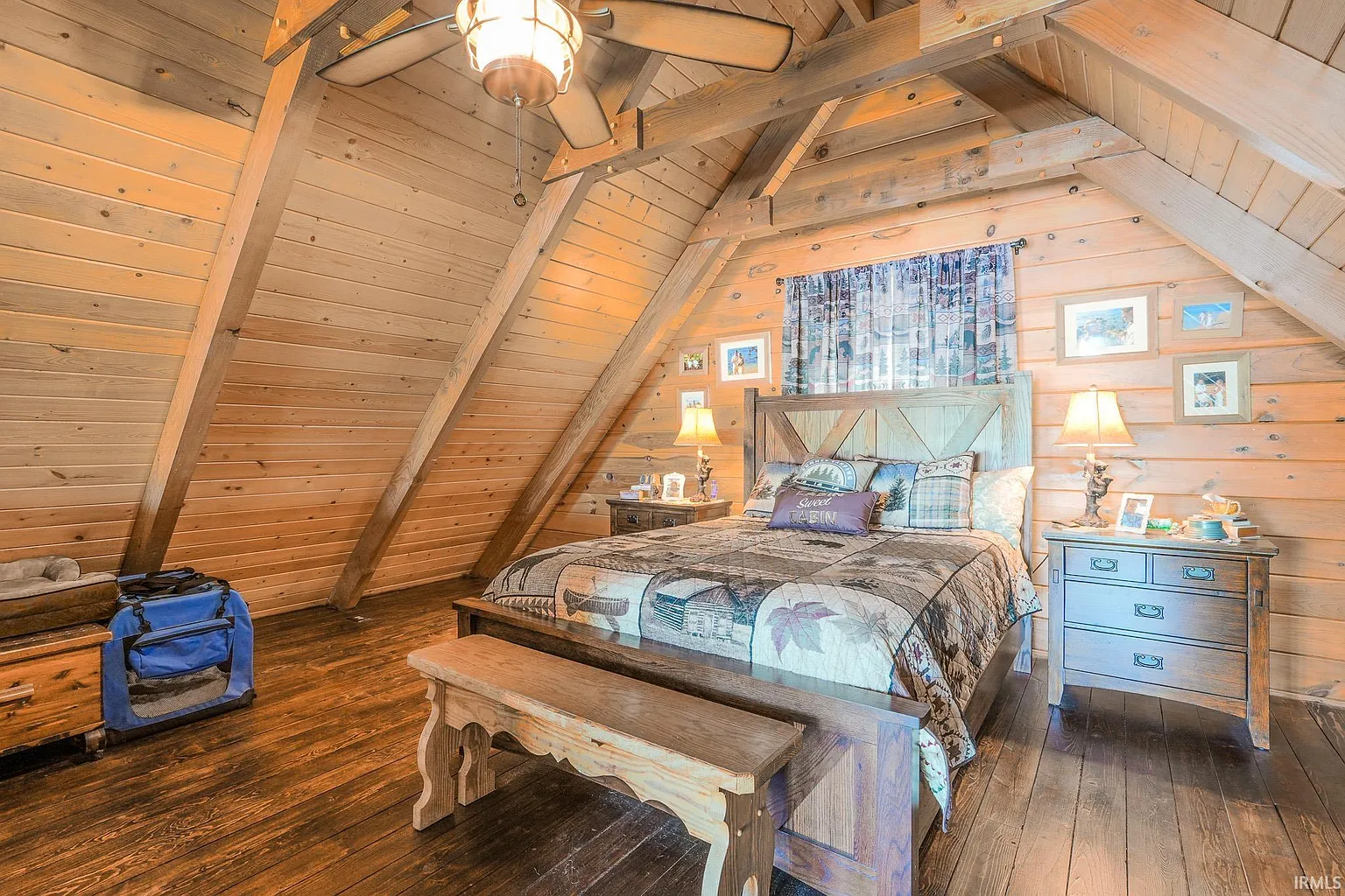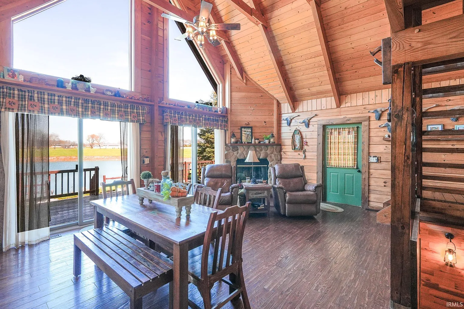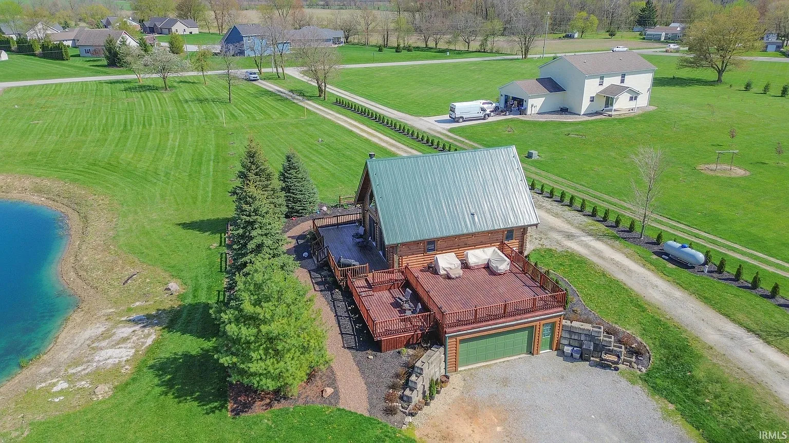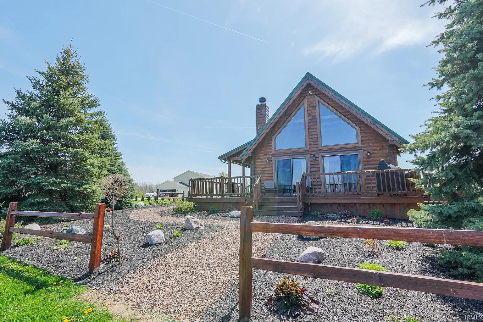 Nestled back from the road on a quiet 1.59-acre lot, on 1247 North Wayne Street in Warren, Indiana, this warm and welcoming log cabin offers a unique blend of privacy, charm, and easy access to town. Developed in 1999, the home has been thoughtfully maintained and updated, backing up to a wooded area with tranquil pond views from multiple vantage points, including the great room, loft bedroom, and wraparound decks. Frequent wildlife sightings add a sense of calm and connection with nature, perfect for outdoor enthusiasts, hunters, and explorers alike. Inside, you’ll find 1,944 square feet of warm and inviting living space, featuring two spacious bedrooms and two full baths. The main level features an open layout graced with walnut hardwood floors, large windows that flood the space with natural light, and a wood-burning fireplace that anchors the living area. The remodeled bathroom has a clean, modern look, while the kitchen and dining area maintain the cabin’s natural wood aesthetic. Upstairs, the loft bedroom overlooks the living space below, giving a cozy, tucked-away feeling. Downstairs, the finished basement adds flexibility and warmth with an electric fireplace, a walk-in closet, and a half bath. A newer HVAC system, metal roof, gas stove, washer, and dryer have all been recently updated, along with fresh landscaping and young trees planted for future privacy. The covered front porch and new back deck are perfect for relaxing, entertaining, or simply taking in the quiet views. An attached two-car garage makes daily life easy year-round. Whether seeking a private nature retreat, a hunting base, or an escape from the noise, this cabin offers the perfect mix of rustic living and modern comfort. Don’t miss the opportunity to make this ideal countryside retreat yours – schedule your private showing today!