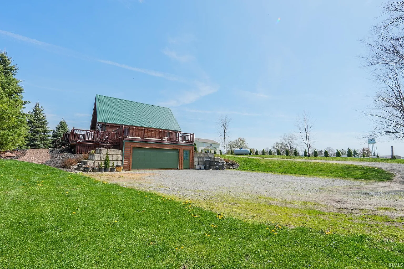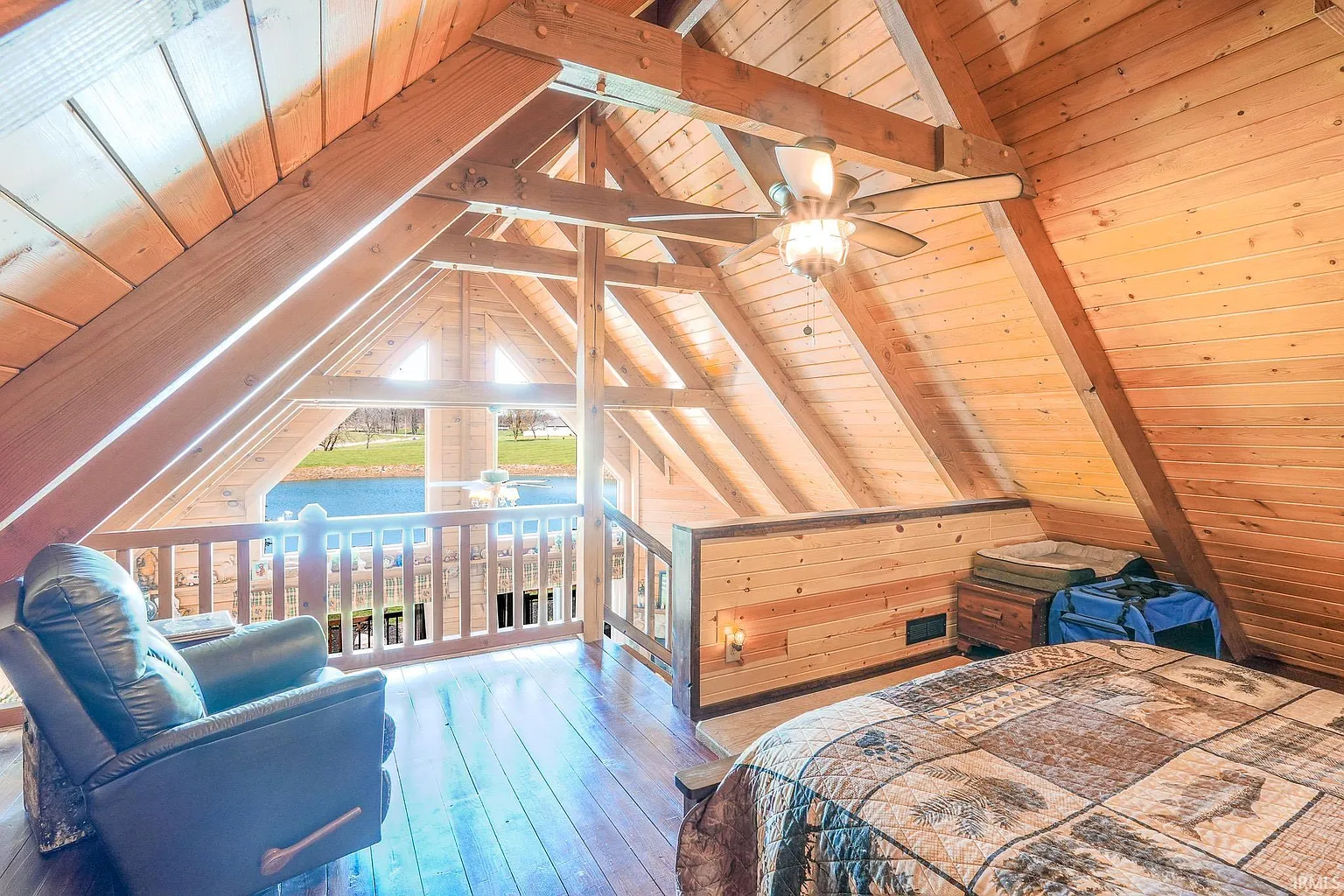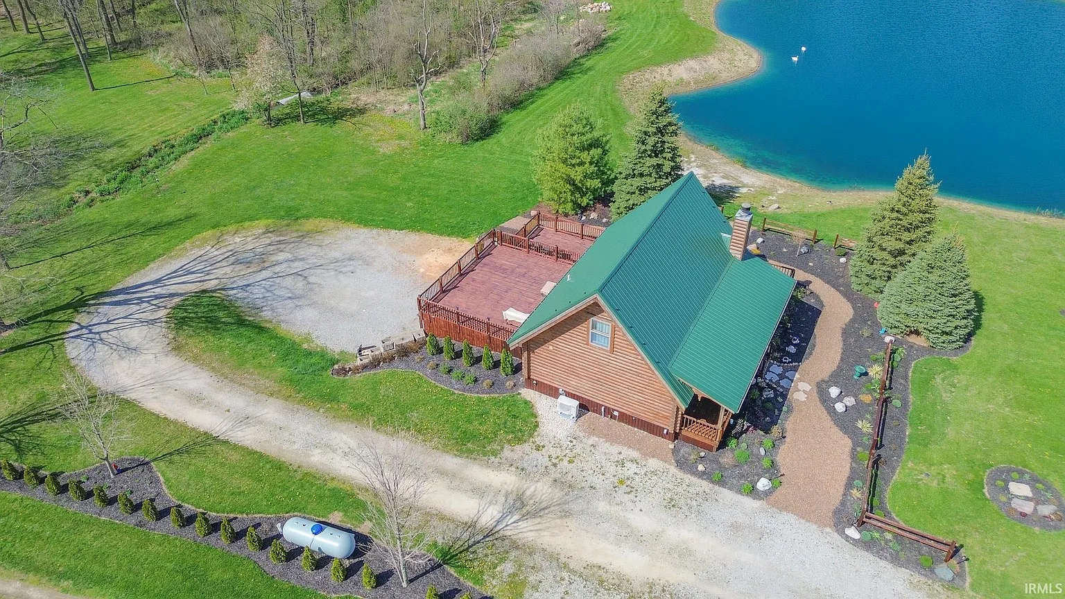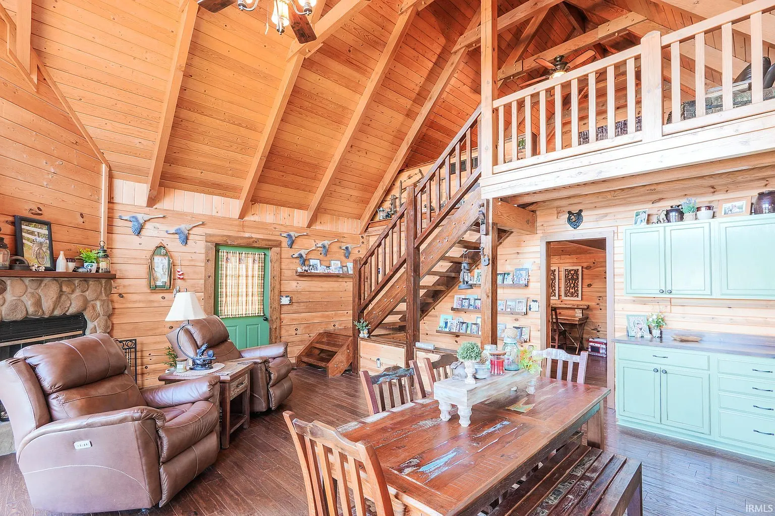 Nestled back from the road on a quiet 1.59-acre lot, on 1247 North Wayne Street in Warren, Indiana, this warm and welcoming log cabin offers a unique blend of privacy, charm, and easy access to town. Developed in 1999, the home has been thoughtfully maintained and updated, backing up to a wooded area with tranquil pond views from multiple vantage points, including the great room, loft bedroom, and wraparound decks. Frequent wildlife sightings add a sense of calm and connection with nature, perfect for outdoor enthusiasts, hunters, and explorers alike. Inside, you’ll find 1,944 square feet of warm and inviting living space, featuring two spacious bedrooms and two full baths. The main level features an open layout graced with walnut hardwood floors, large windows that flood the space with natural light, and a wood-burning fireplace that anchors the living area. The remodeled bathroom has a clean, modern look, while the kitchen and dining area maintain the cabin’s natural wood aesthetic. Upstairs, the loft bedroom overlooks the living space below, giving a cozy, tucked-away feeling. Downstairs, the finished basement adds flexibility and warmth with an electric fireplace, a walk-in closet, and a half bath. A newer HVAC system, metal roof, gas stove, washer, and dryer have all been recently updated, along with fresh landscaping and young trees planted for future privacy. The covered front porch and new back deck are perfect for relaxing, entertaining, or simply taking in the quiet views. An attached two-car garage makes daily life easy year-round. Whether seeking a private nature retreat, a hunting base, or an escape from the noise, this cabin offers the perfect mix of rustic living and modern comfort. Don’t miss the opportunity to make this ideal countryside retreat yours – schedule your private showing today!