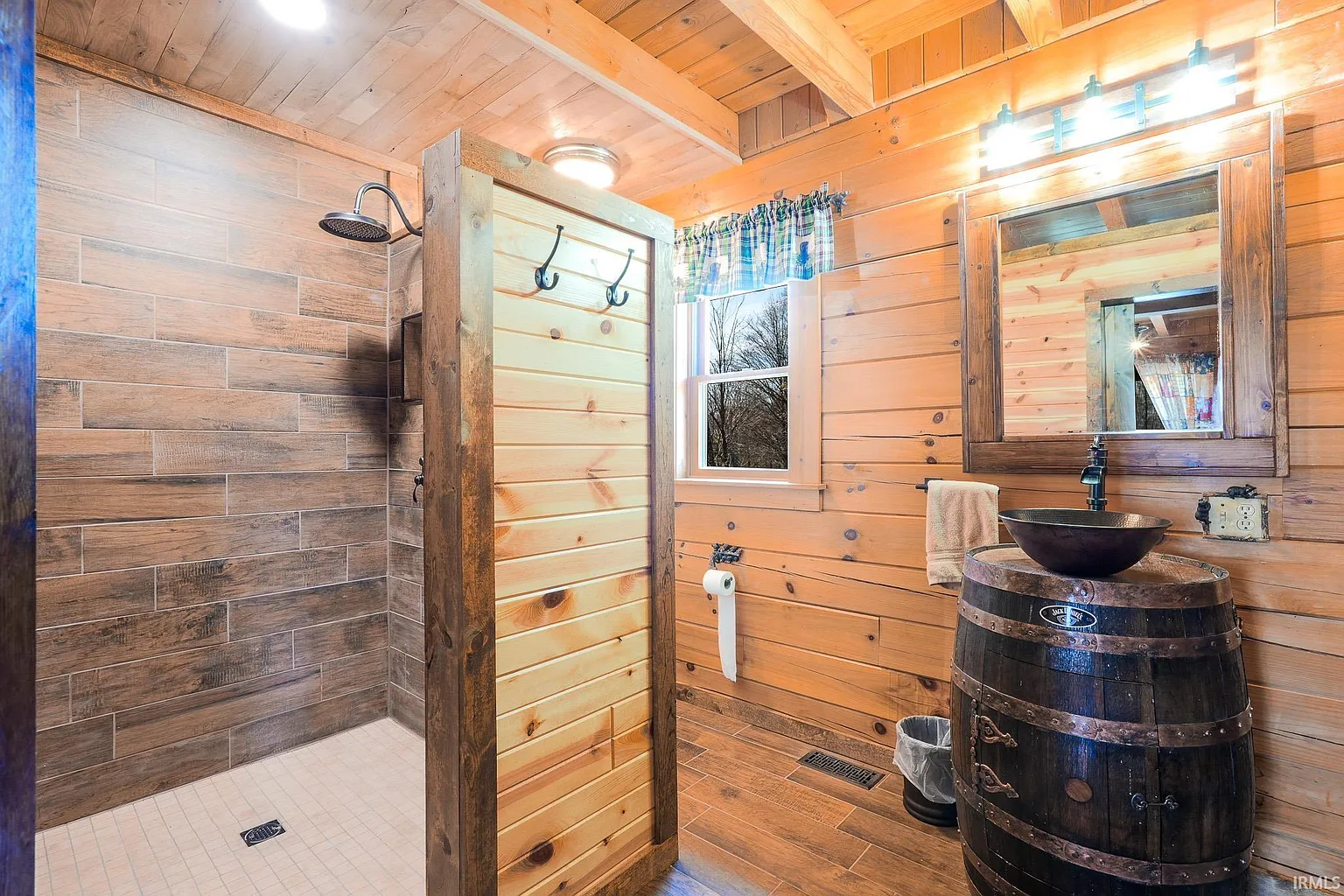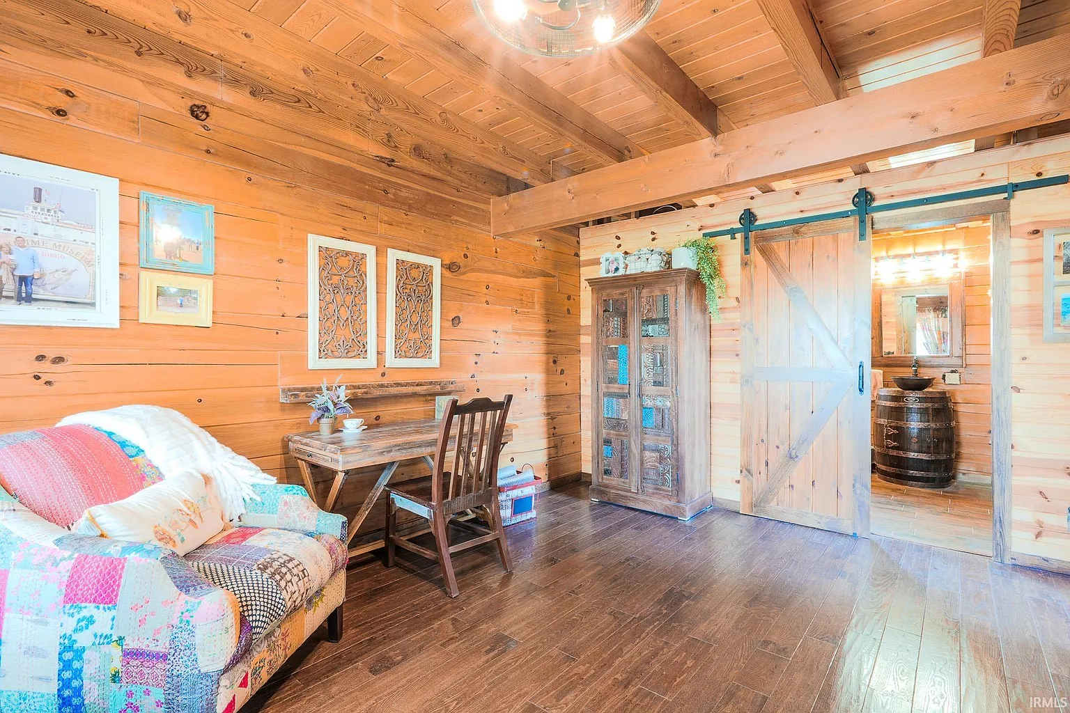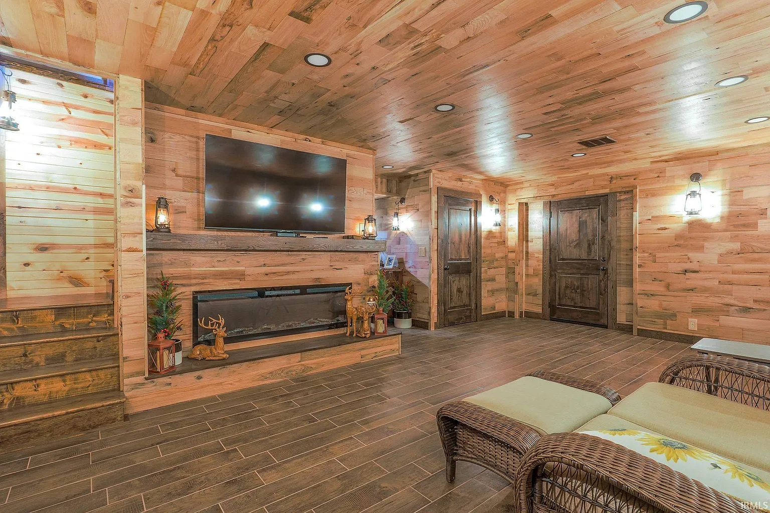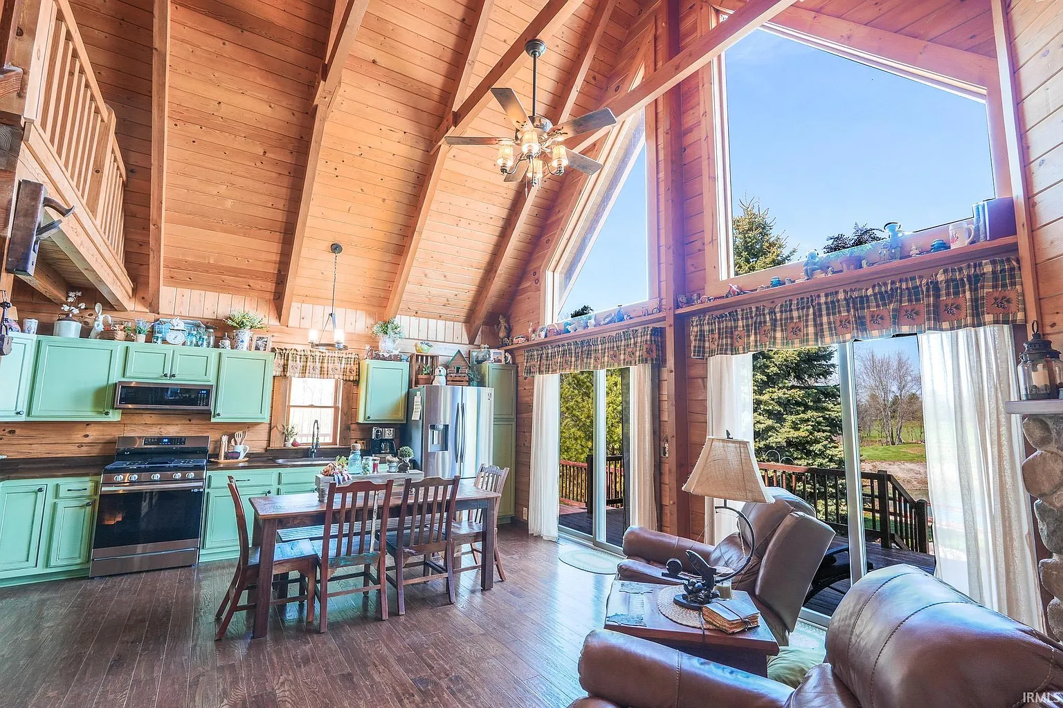 Nestled back from the road on a quiet 1.59-acre lot, on 1247 North Wayne Street in Warren, Indiana, this warm and welcoming log cabin offers a unique blend of privacy, charm, and easy access to town. Developed in 1999, the home has been thoughtfully maintained and updated, backing up to a wooded area with tranquil pond views from multiple vantage points, including the great room, loft bedroom, and wraparound decks. Frequent wildlife sightings add a sense of calm and connection with nature, perfect for outdoor enthusiasts, hunters, and explorers alike. Inside, you’ll find 1,944 square feet of warm and inviting living space, featuring two spacious bedrooms and two full baths. The main level features an open layout graced with walnut hardwood floors, large windows that flood the space with natural light, and a wood-burning fireplace that anchors the living area. The remodeled bathroom has a clean, modern look, while the kitchen and dining area maintain the cabin’s natural wood aesthetic. Upstairs, the loft bedroom overlooks the living space below, giving a cozy, tucked-away feeling. Downstairs, the finished basement adds flexibility and warmth with an electric fireplace, a walk-in closet, and a half bath. A newer HVAC system, metal roof, gas stove, washer, and dryer have all been recently updated, along with fresh landscaping and young trees planted for future privacy. The covered front porch and new back deck are perfect for relaxing, entertaining, or simply taking in the quiet views. An attached two-car garage makes daily life easy year-round. Whether seeking a private nature retreat, a hunting base, or an escape from the noise, this cabin offers the perfect mix of rustic living and modern comfort. Don’t miss the opportunity to make this ideal countryside retreat yours – schedule your private showing today!