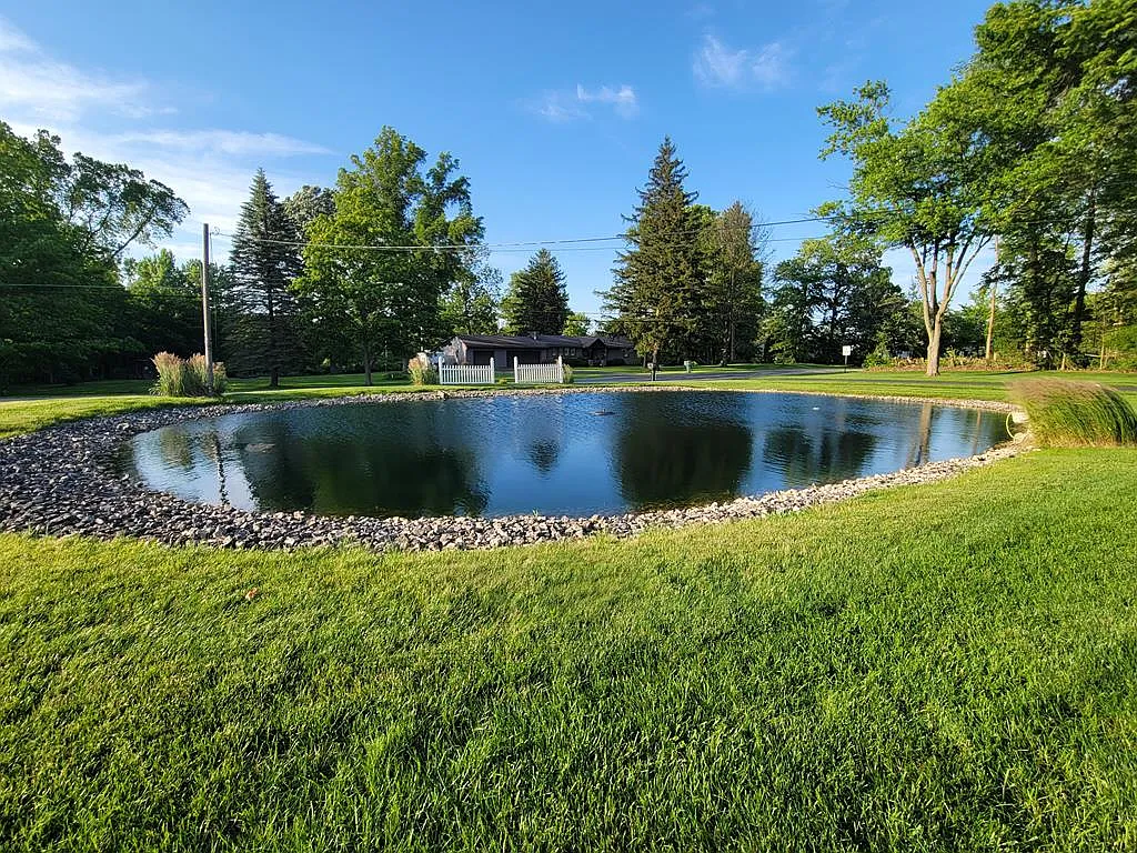 The nearly 1-acre lot with a pond enhances the outdoor experience.