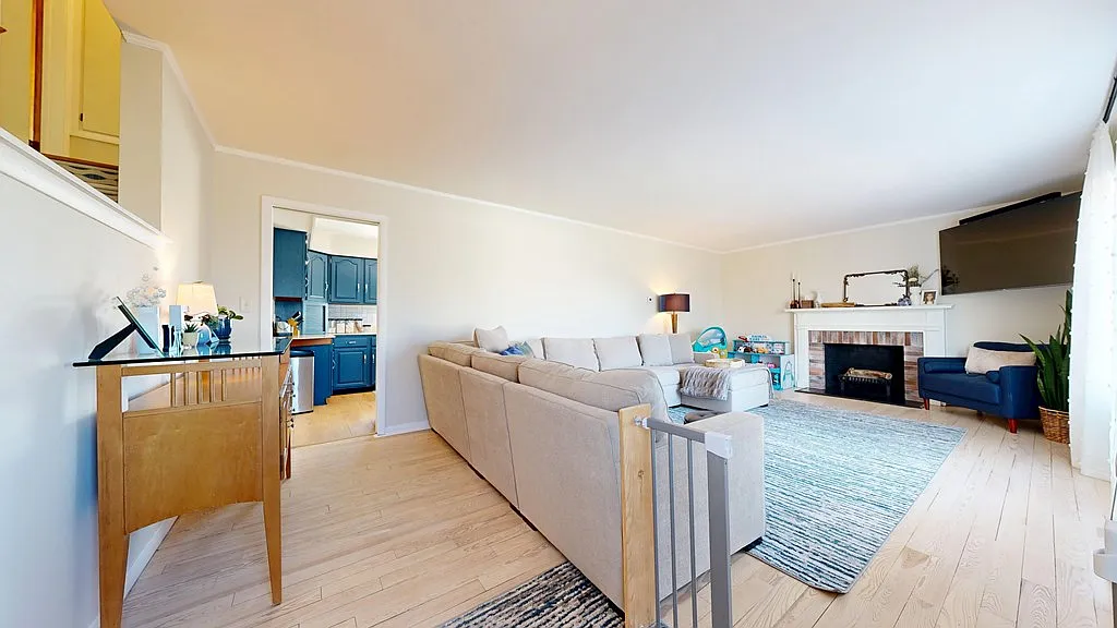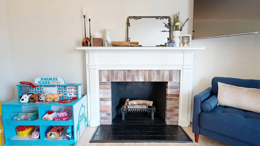 The living room fireplace adds warmth and character to the space.