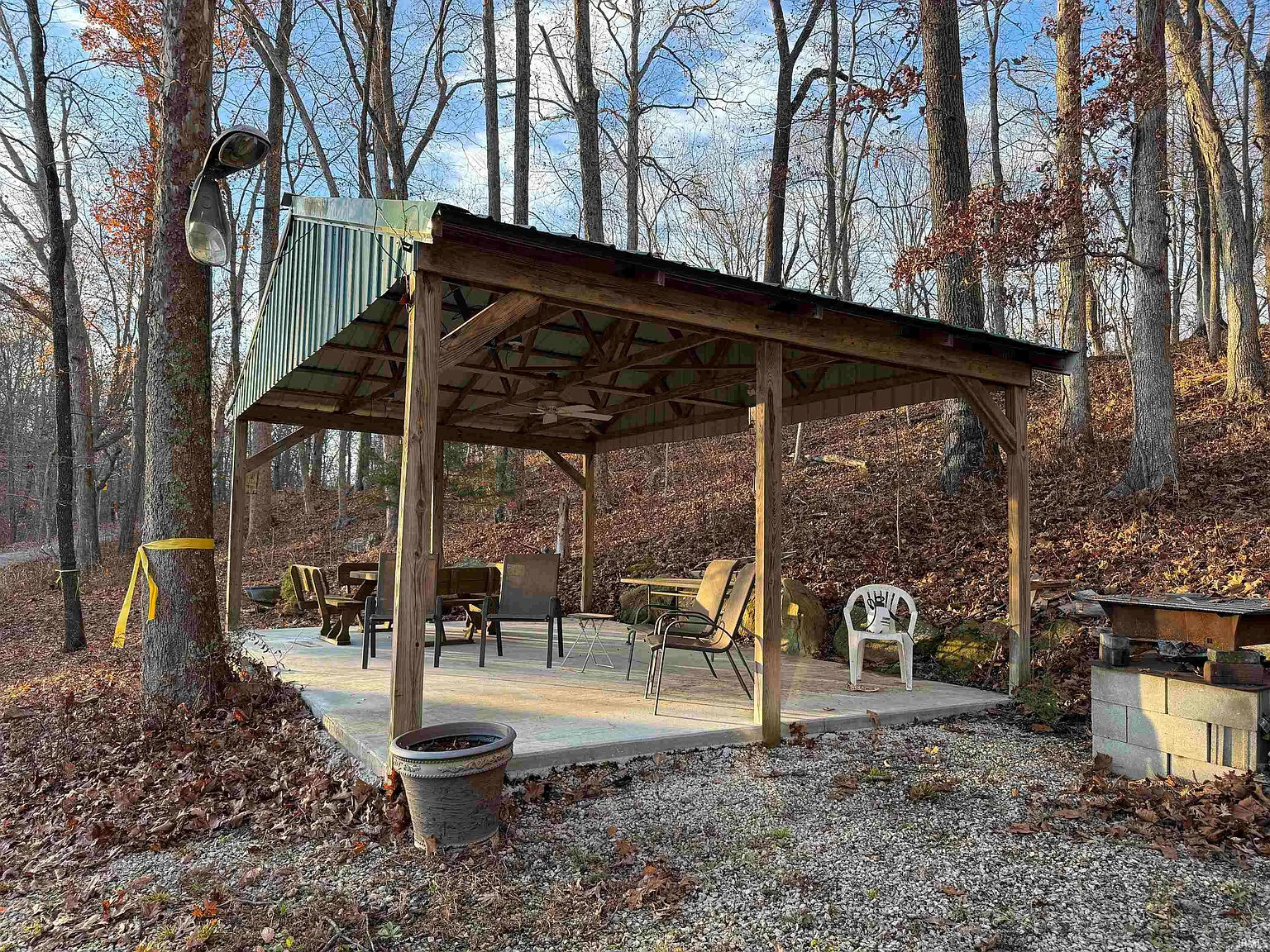 Nestled along the peaceful banks of the White River, on 11684 East State Road 450 in Shoals, Indiana, this cozy cabin offers the perfect weekend escape on 2 tranquil, wooded acres just 13 miles from Bedford. Developed in 2007 and designed for easy maintenance and relaxed living, this rustic retreat features a welcoming 8×24 covered porch overlooking the river, creating a serene spot for enjoying a cup of morning coffee, afternoon reading, or connecting with nature. Inside, the home offers 484 square feet of living space, including a spacious 10×10 full bath and simple, functional amenities such as a microwave, refrigerator, and electric range. Outside, the property shines, offering a 24×16 covered picnic pavilion with a concrete floor perfect for gatherings or additional workspace. With access to a concrete loading ramp, getting boats, kayaks, and gear into the water is a breeze. The cabin’s riverfront setting delivers abundant wildlife, peaceful views, and the kind of quiet seclusion that makes weekend retreats truly restorative. Whether seeking a cozy hunting basecamp, a minimalist getaway cabin, or a charming studio retreat, this property offers comfort, convenience, and a beautiful natural setting in one affordable package. With public water, septic, and simple utilities already in place, it’s ready for your next adventure.