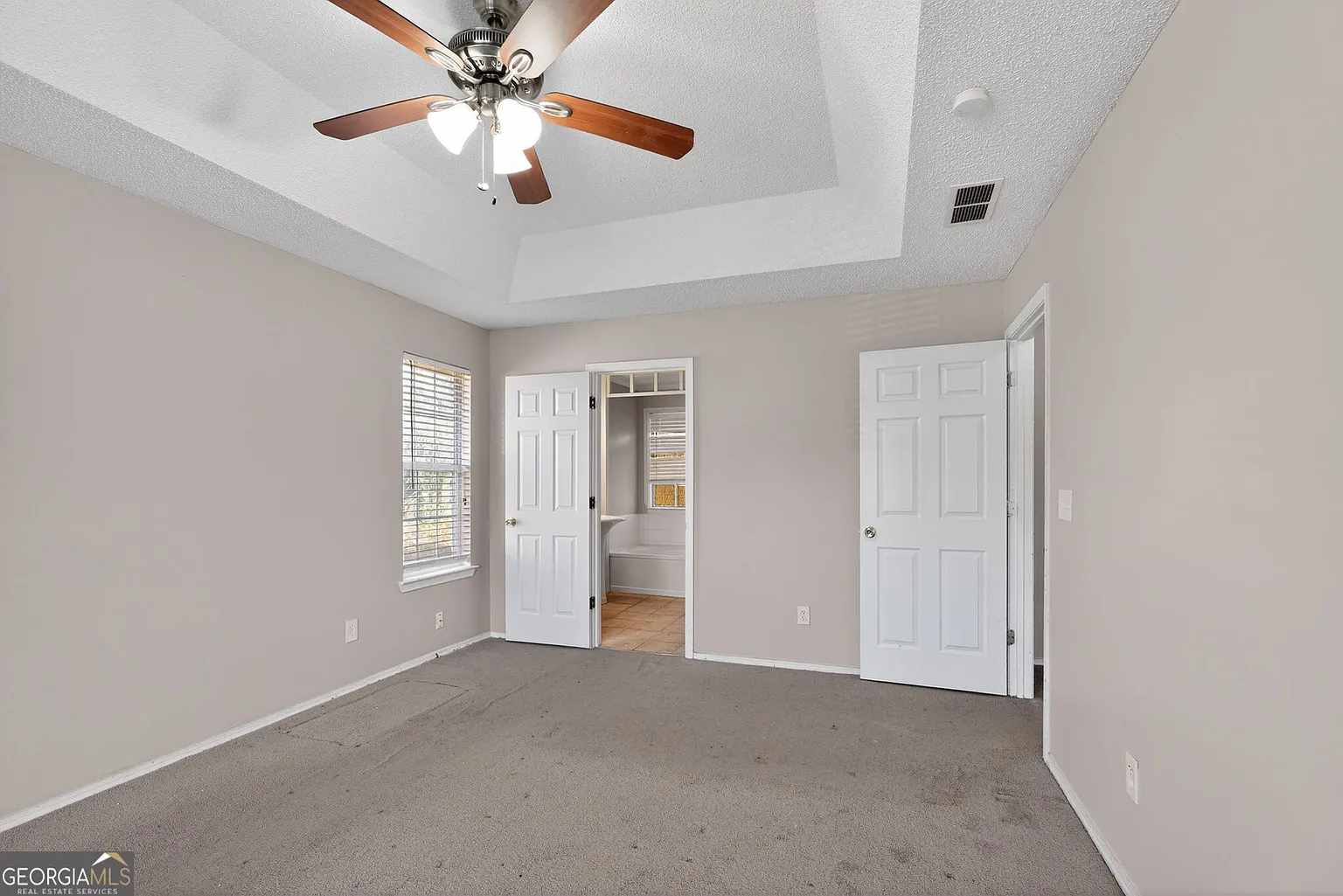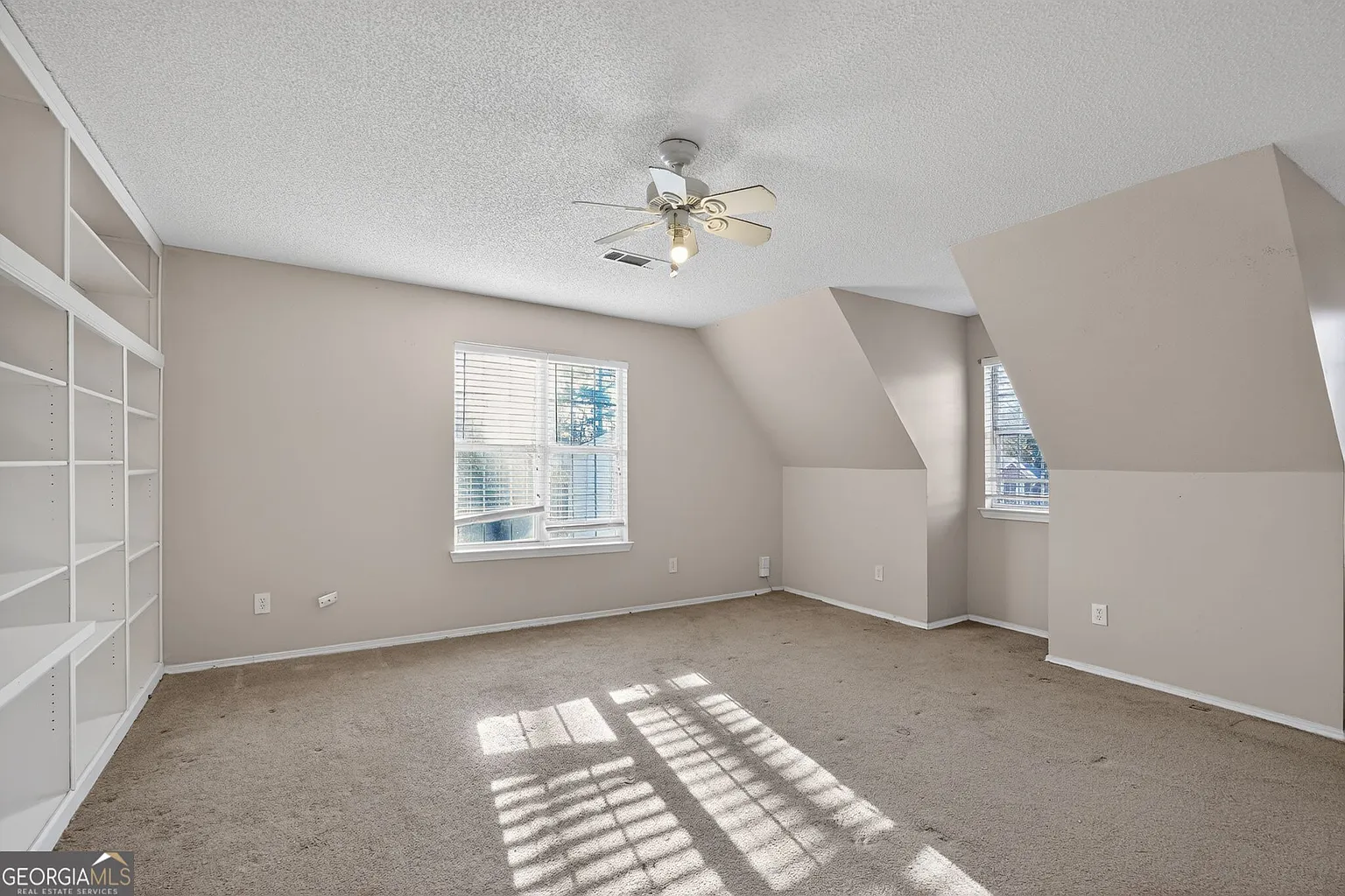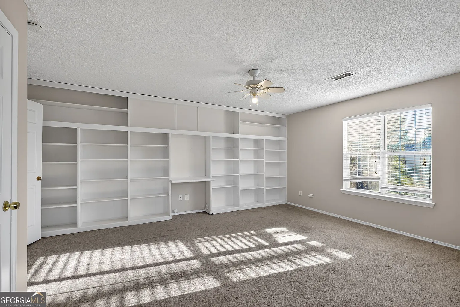The space features neutral color tones, large windows, tray ceilings, bay windows, ceiling fans, and built-in bookshelves, creating a warm and inviting atmosphere throughout the home.