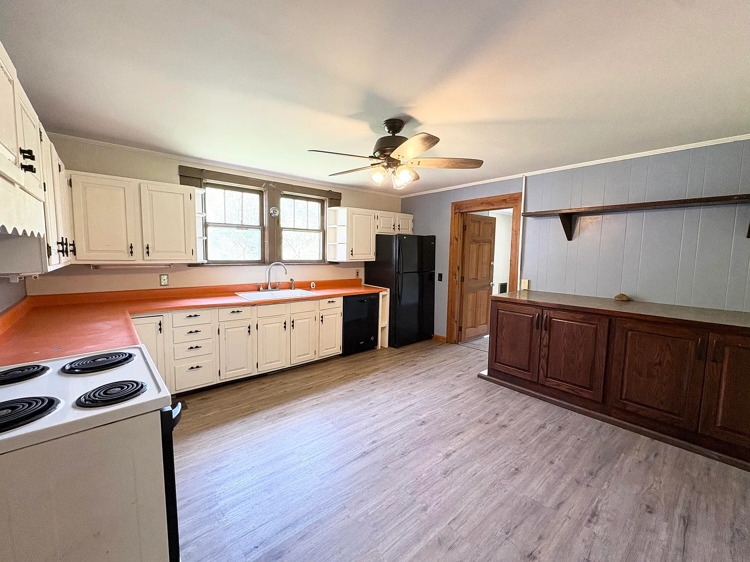 The kitchen has been refreshed with painted cabinetry and updated appliances, including a brand-new refrigerator and dishwasher.