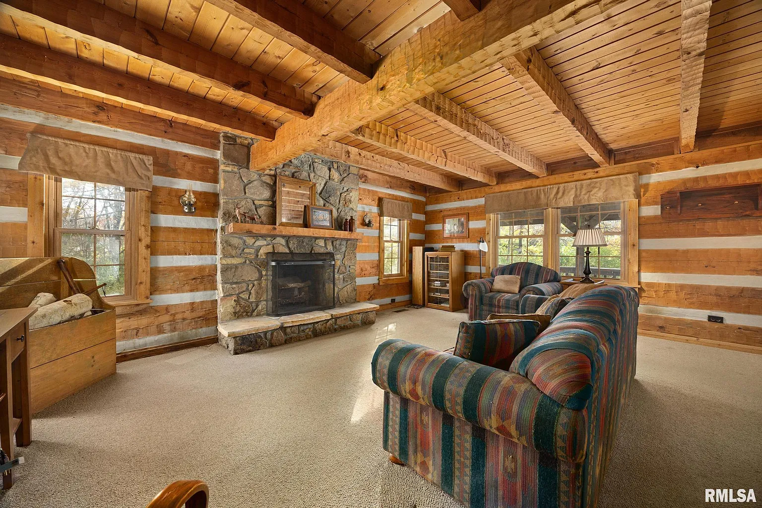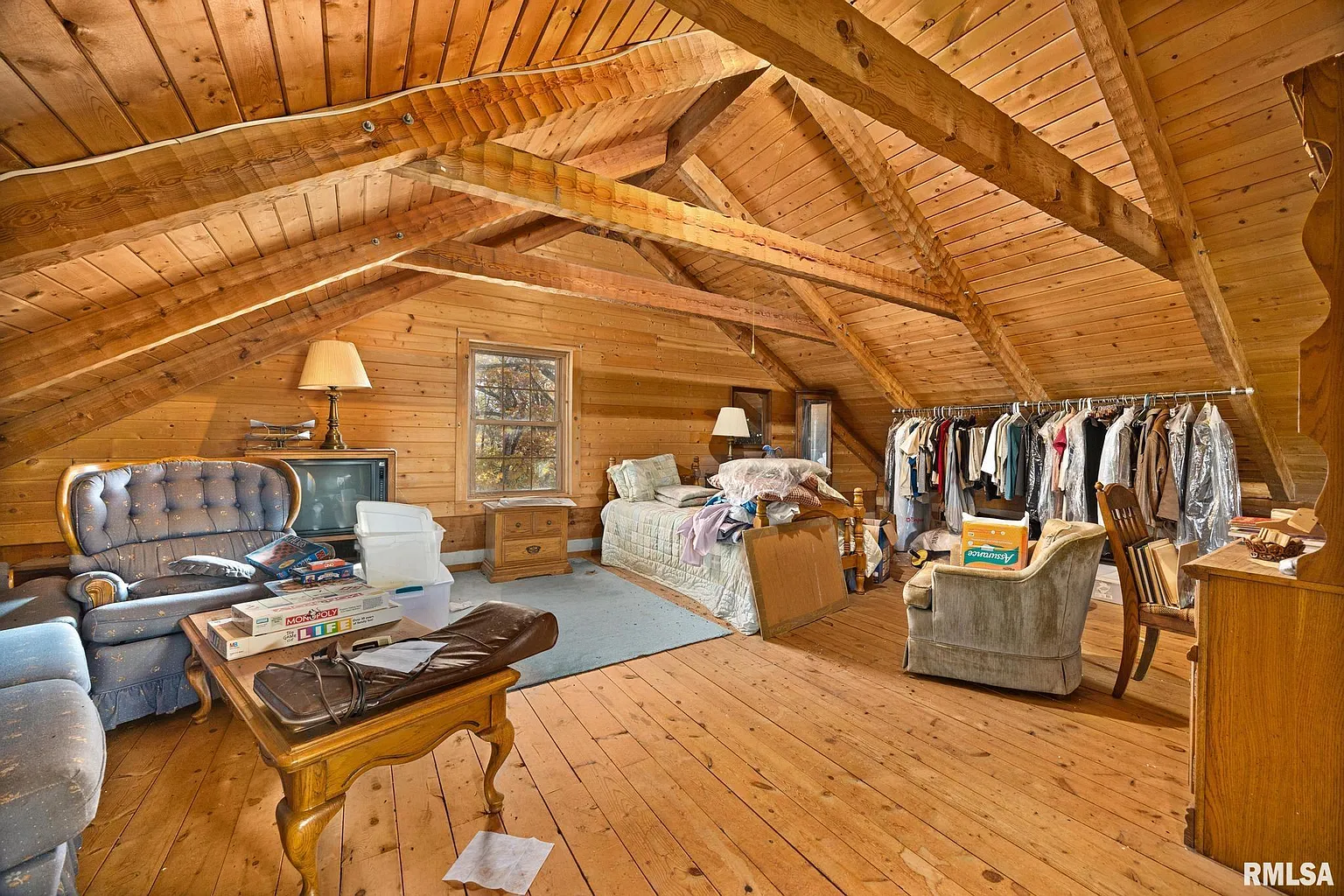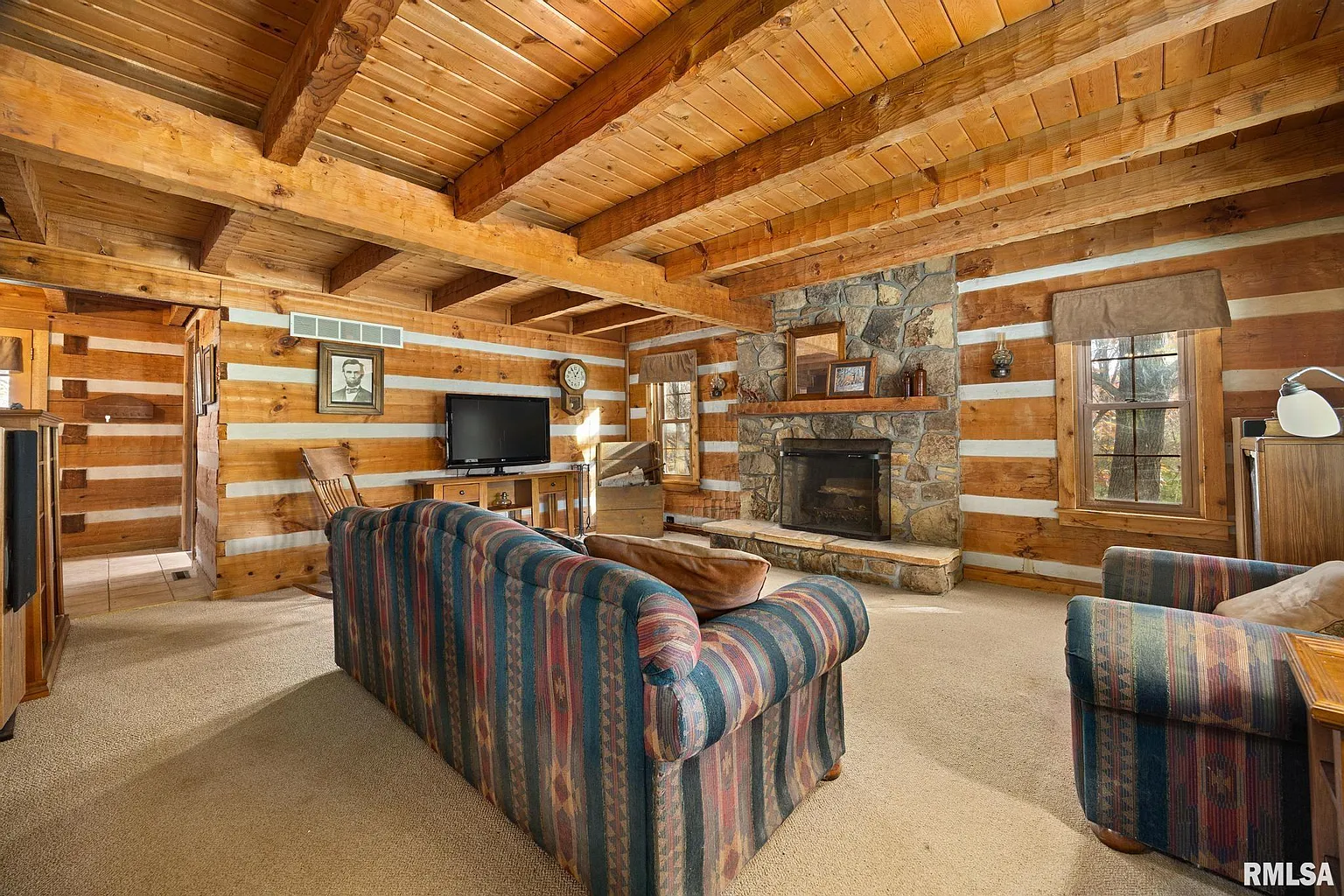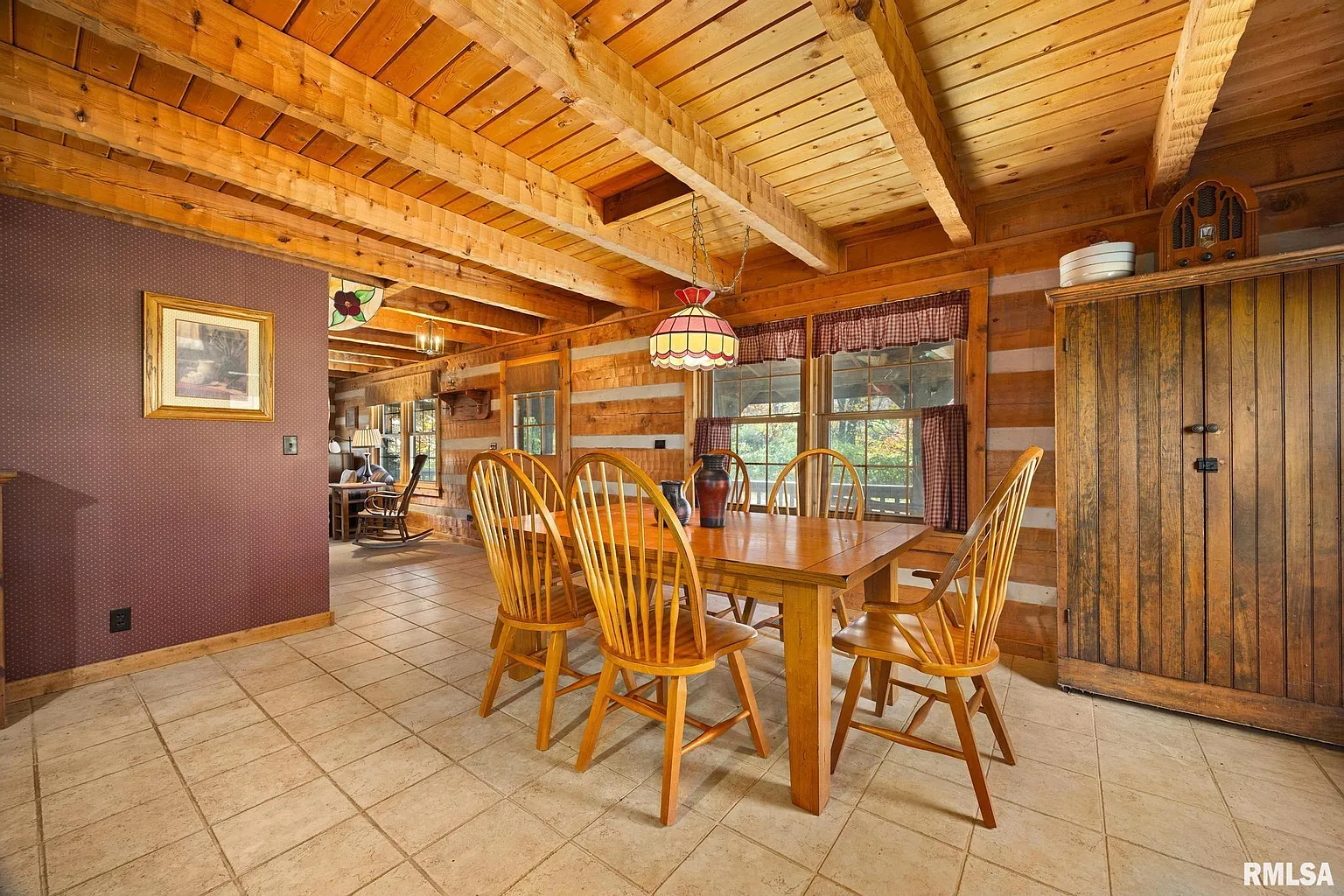 Nestled on 5 wooded acres on 438 Tazewood Road in Metamora, Illinois, this hand-crafted log cabin blends rustic character with everyday comfort, perfect for nature lovers, outdoor enthusiasts, investors, and adventure-seekers alike. Developed in 1988 with timeless craftsmanship, the home spans 1,986 square feet of warm wood tones, natural light, and thoughtful spaces. Inside, the main level features a cozy living room with exposed beams and a wood-burning fireplace, a spacious kitchen perfect for gatherings, and a comfortable bedroom. In addition, a mudroom adds convenience for outdoor seasons and daily life. The upper floor offers a generous 34’x25′ open loft offering endless possibilities for a guest area, studio, office, or a quiet retreat overlooking the living room, adding flexibility. The full unfinished basement provides additional storage space or room for future expansion. The home is equipped with propane forced-air heat, central air, and included appliances. Outside, the setting delivers everything people hope for in a private cabin escape. Mature trees surround the property, a porch offers a spot to watch wildlife drift through, and the level acreage makes the land easy to use. An oversized 2.5-car detached garage provides space for vehicles, tools, and hobbies, and an above-ground pool adds a fun touch for warm weather. Conveniently secluded yet within easy reach of town, this property offers a rare chance to own a true log-cabin retreat where comfort, history, beauty, and potential come together. Don’t miss the opportunity to make it yours – schedule your private showing now!